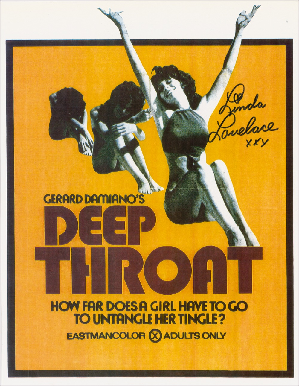Color satin-finish 8.5 x 11 reproduction poster for Deep Throat, signed in black felt tip, ?Linda Lovelace, xxx.? Originally obtained by in-person specialist Mike Wehrmann. In fine condition, with a long vertical emulsion scratch near left edge. Pre-certified PSA/DNA and RRAuction COA.