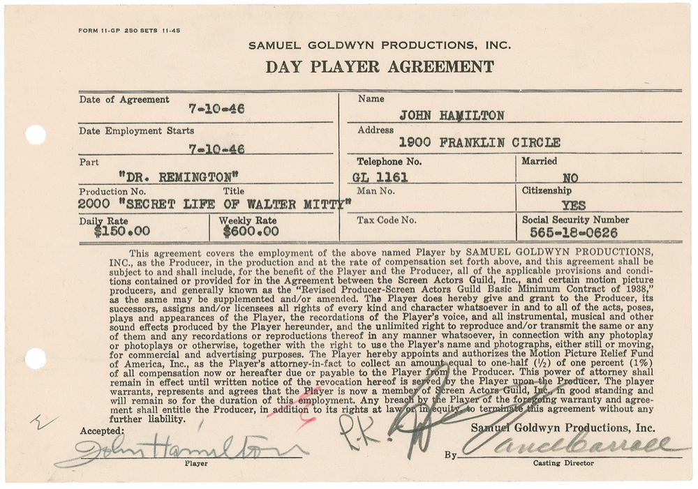 Character actor (1887–1958) best known as Daily Planet editor Perry White on the 1950s television series Adventures of Superman. DS, one page, 8.5 x 6, July 10, 1946. Samuel Goldwyn Productions Day Player Agreement for Hamilton to portray Dr. Remington in The Secret Life of Walter Mitty for a daily rate of $150 per day. Signed at the conclusion in pencil by Hamilton. In fine condition, with two punch holes to left side, and several office marks and signature at bottom. Pre-certified PSA/DNA and RRAuction COA.