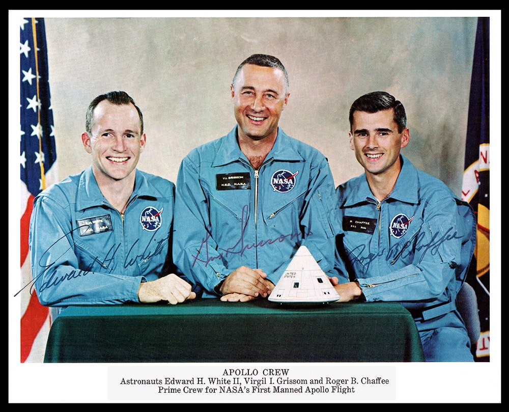 During a training exercise in the Apollo 1 command module on January 27, 1967, a flash fire, later determined to be caused by exposed wiring in the highly pressurized, oxygen-saturated environment, engulfed the capsule. Within minutes, all three crew members, unable to escape from the tightly sealed capsule, had perished in the most deadly American space-related accident until the explosion of the space shuttle Challenger nearly two decades later. Very rare color 10 x 8 NASA photo of the Apollo 1 crew posing in their blue flight suits with a model of their capsule, signed in blue felt tip, “Edward H. White II,” “Gus Grissom,” and “Roger B. Chaffee.” In fine condition, with some light creasing to lower right corner tip. Only 15 to 20 Apollo 1 crew-signed portraits are believed to exist. This very photo, when it last appeared on the market, sold for over $10,000. Easily considered the rarest of all Apollo crew signed portraits, this is the first one we have ever offered! Pre-certified Scott Cornish and RRAuction COA.