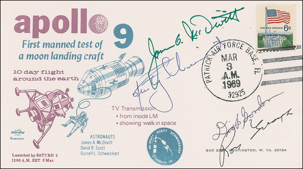 Commemorative cover with a cachet honoring Apollo 9, signed in green felt tip by James A. McDivitt, in blue ballpoint by Rusty Schweikart, in black ballpoint by Dick Gordon, and in black felt tip by Ron Evans. In fine condition. Pre-certified Scott Cornish and RRAuction COA.