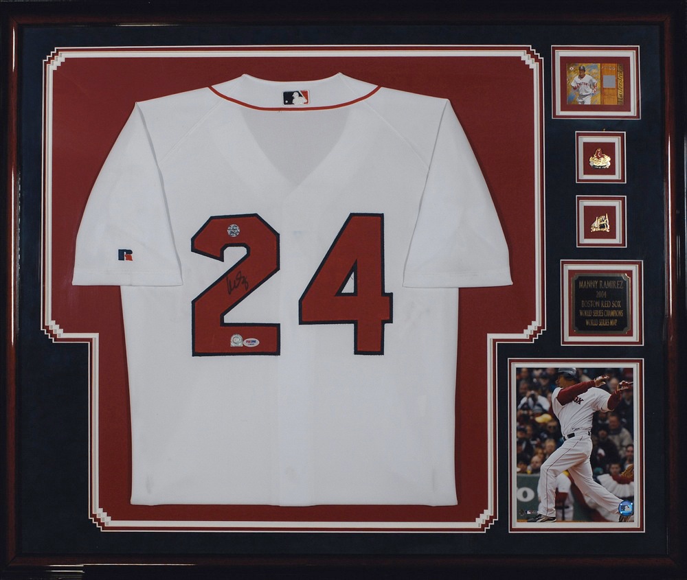 Official Russell replica Boston Red Sox baseball jersey, with sewn on numbers, signed in black felt tip on the number on the back. Accompanied by a certificate of authenticity from PSA/DNA. Triple suede matted and framed with a photo of Ramirez at the plate, a trading card, two pins, and a small name plaque, to an overall size of 43 x 35. In very fine condition, a PSA/DNA authentication label affixed to number. Oversized. Pre-certified Steve Grad/PSA/DNA and RRAuction COA.
