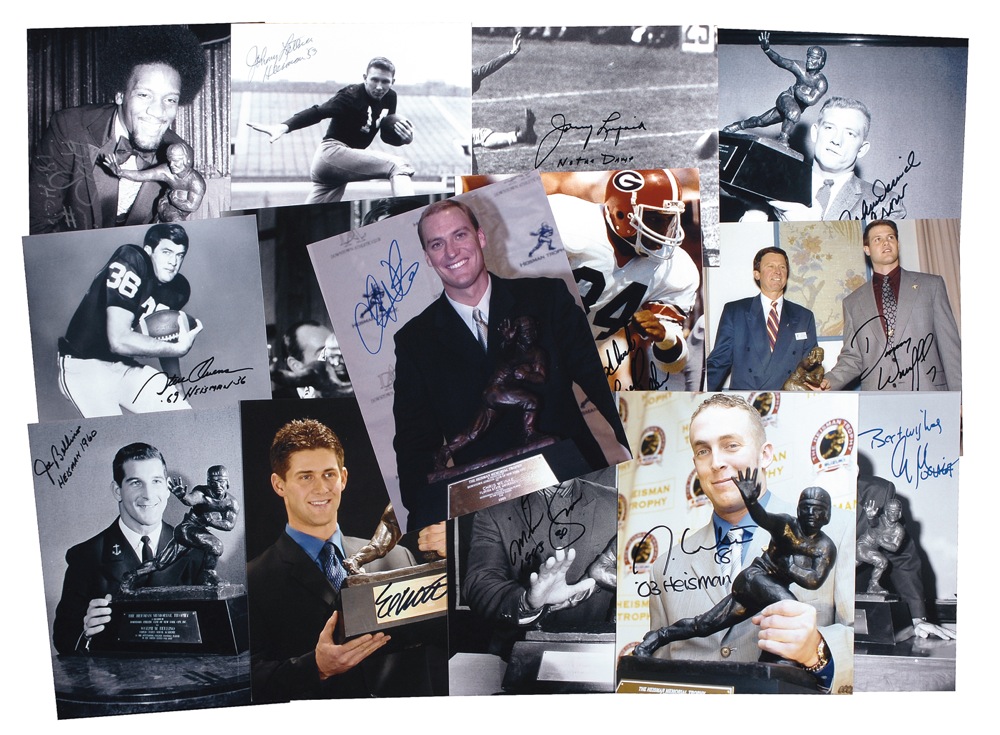 Fourteen glossy photos, including four color, 8 x 10 and 10 x 8, each signed in ink or felt tip by the respective Heisman Trophy-winner pictured. Signers are: John David Crow, Danny Wuerffel, Johnny Lattner, Herschel Walker, Johnny Lujack, Billy Sims, John Cappelletti, Eric Crouch, Mike Rozier, Jason White, Gary Beban, Chris Weinke, Steve Owens, and Joe Bellino. In overall fine condition. RRAuction COA.