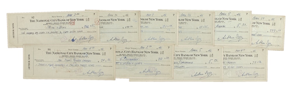 Polish-born American artist (1894–1951) best known for his works on Jewish subjects and his anti-Axis illustrations and caricatures during World War II. Ten personal checks, all approximately 8.5 x 3.25, each filled out and signed by Szyk, all dated between April-May 1946. In very good overall condition. RRAuction COA.