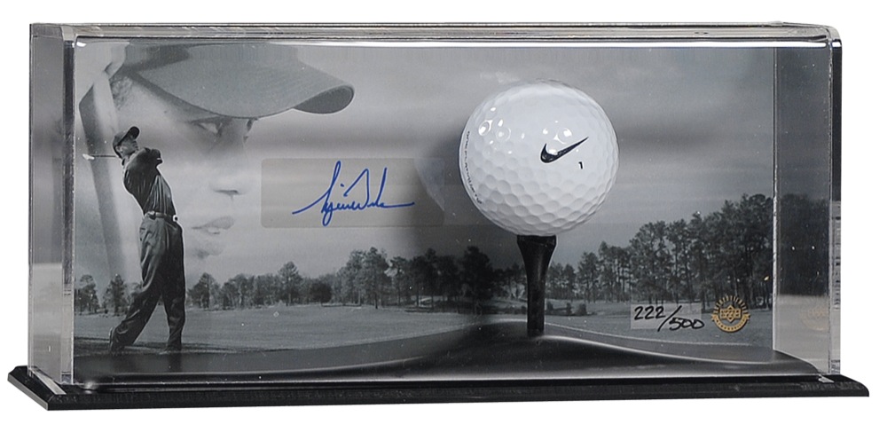 Limited edition Tiger Woods autographed trading card and range-driven ball display. Trading card, #222/500, measures 8 x 3.5, and is signed in blue felt tip on a special area on the front of the card. Accompanied by a Nike 1 practice ball, range driven by Woods, and a Lucite display case. Reverse of card bears a statement of authenticity from Upper Deck. Display is housed in its original shipping box. In very fine condition. Pre-certified Steve Grad/PSA/DNA and RRAuction COA.