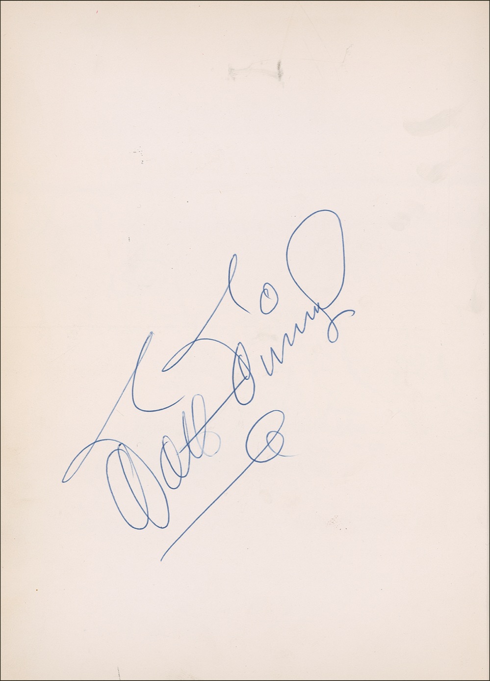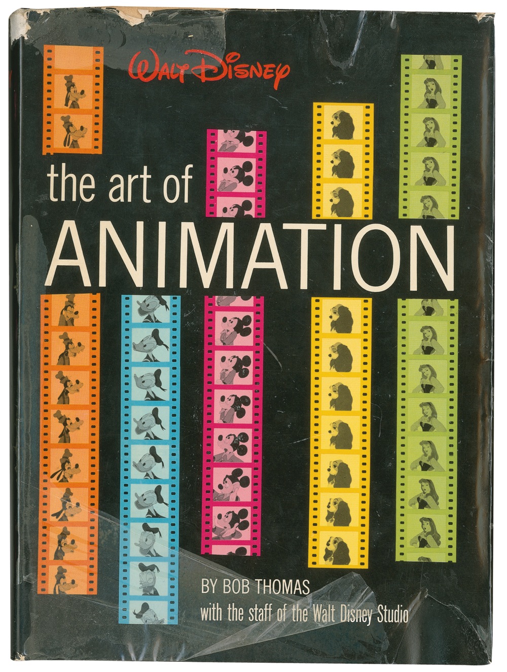Signed book: The Art of Animation. First edition. NY: Simon and Schuster, 1958. Hardcover with dustjacket, 8.25 x 11.25, 181 pages. Beautifully signed in blue ballpoint on the reverse of the first free end page, “Walt Disney.” Accompanied by a 1995 TLS to Disney expert Phil Sears from the original owner stating, in part: “On April 20, 1959, while employed as a Guild Extra on the Walt Disney Production, Toby Tyler, or Ten Weeks with a Circus, I bought a hardcover copy of Walt Disney’s the art of Animation…It was my good fortune that Mr. Disney visited the set on the back-lot that afternoon, and graciously honored my request for his autograph…I can absolutely vouch for its authenticity, as he signed it directly before me.” Book is also accompanied by a certificate of authenticity from Phil Sears. A bit of mild toning to the ends of some pages, some scattered light toning to cover boards, and spine just a touch weak, otherwise fine condition. The dustjacket shows edge chipping, several tears, areas of repaired paper loss, and substantial areas of peeling emulsion. Disney’s bold signature measures a full 6” long! Pre-certified PSA/DNA and RRAuction COA.
