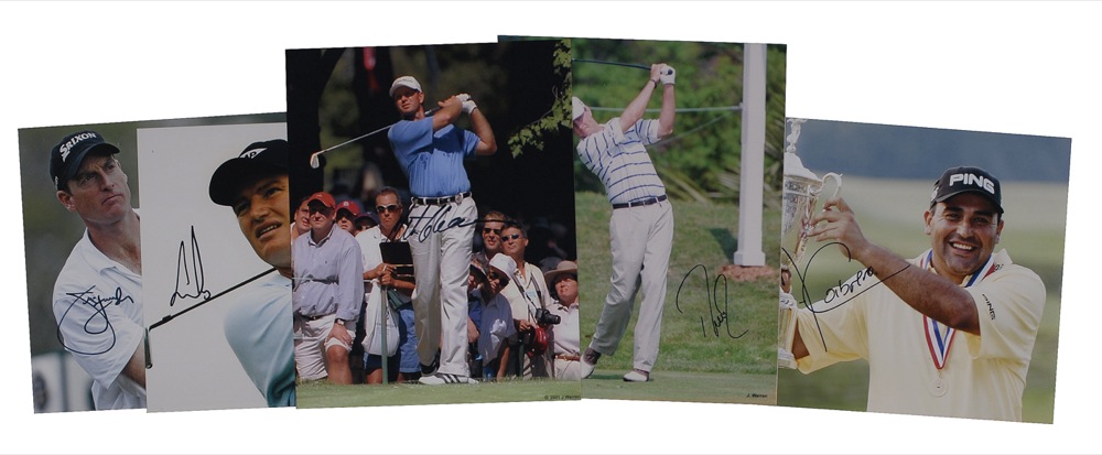 Five color glossy and satin-finish photos, two 8 x 10 and three 10 x 8, each signed in felt tip by the respective champion pictured. Signers include: Angel Cabrera, Ernie Els, Davis Love III, Retief Goosen, and Jim Furyk, . In very fine condition. Pre-certified Steve Grad/PSA/DNA and RRAuction COA.
