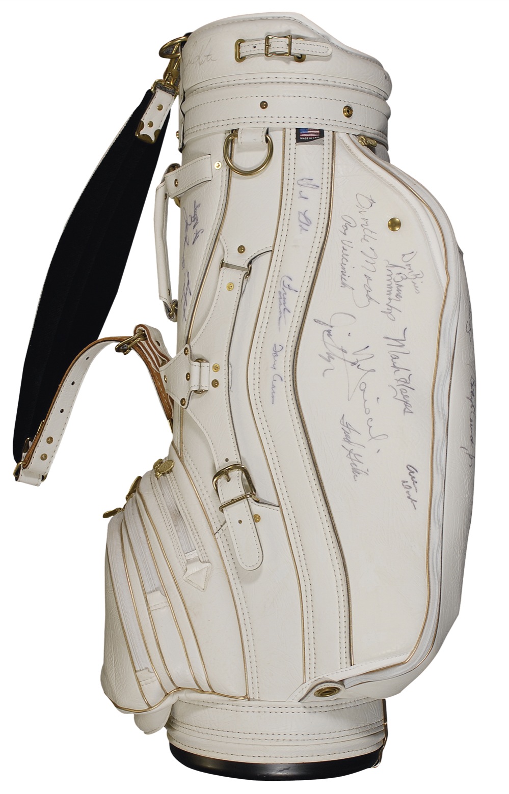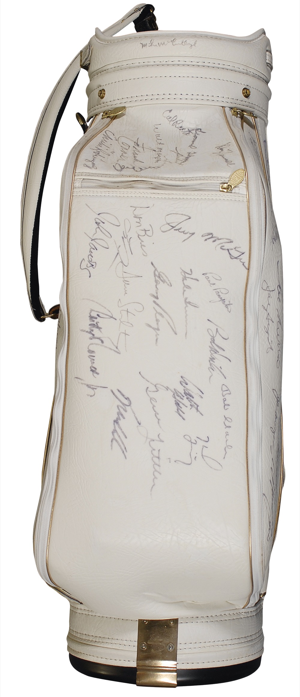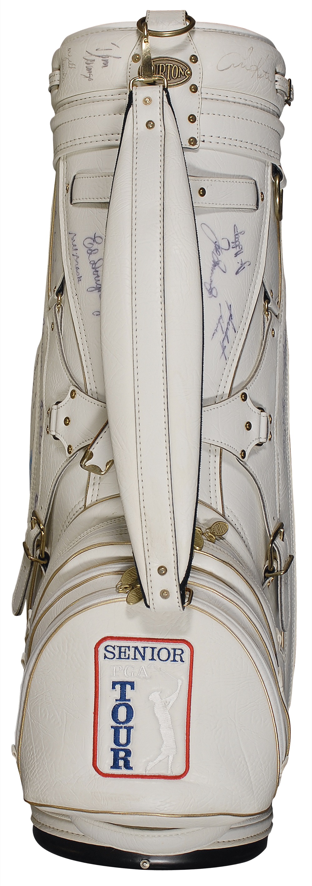 Burton white leather Senior PGA Tour golf bag signed in felt tip on the side by 69 members of the PGA Champions Tours, with the signatures acquired at the 1999 BankBoston Classic and the 2000 FleetBoston Classic, both played at the Nashawtuc Country Club in Concord, Massachusetts. Signers include: Gary Player, Arnold Palmer, Hale Irwin, Lee Trevino, Chi Chi Rodriguez, Gene Littler, Gay Brewer, Tom Kite, Tommy Aaron, Orville Moody, Dave Stockton, Don Bies, Bill Brask, Bob Charles, Frank Conner, Terry Dill, Ed Dougherty, Allen Doyle, Greg Edwards, Al Geiberger, Fred Gibson, Bob Green, Hubert Green, Walter Hall, Mark Hayes, Jim Holtgrieve, Joe Inman, John Jacobs, Tom Jenkins, Mike McCullough, Jerry McGee, John Morgan, Walter Morgan, Paul Parajeckas, Cal Peete, Dana Quigley, Tom Shaw, Jay Sigel, Will Sowles, Bruce Summerhays, Joe Tesori, Doug Tewell, Leonard Thompson, Steve Veriato, Roy Vucinich, Tom Wargo, Bob Wynn, and Walt Zembriski. A few of the players have signed twice. In fine condition, with a bit of scattered trivial soiling, and some light spreading to a few signatures, resulting in a slightly fuzzy appearance. Oversized. Pre-certified Steve Grad/PSA/DNA and RRAuction COA.