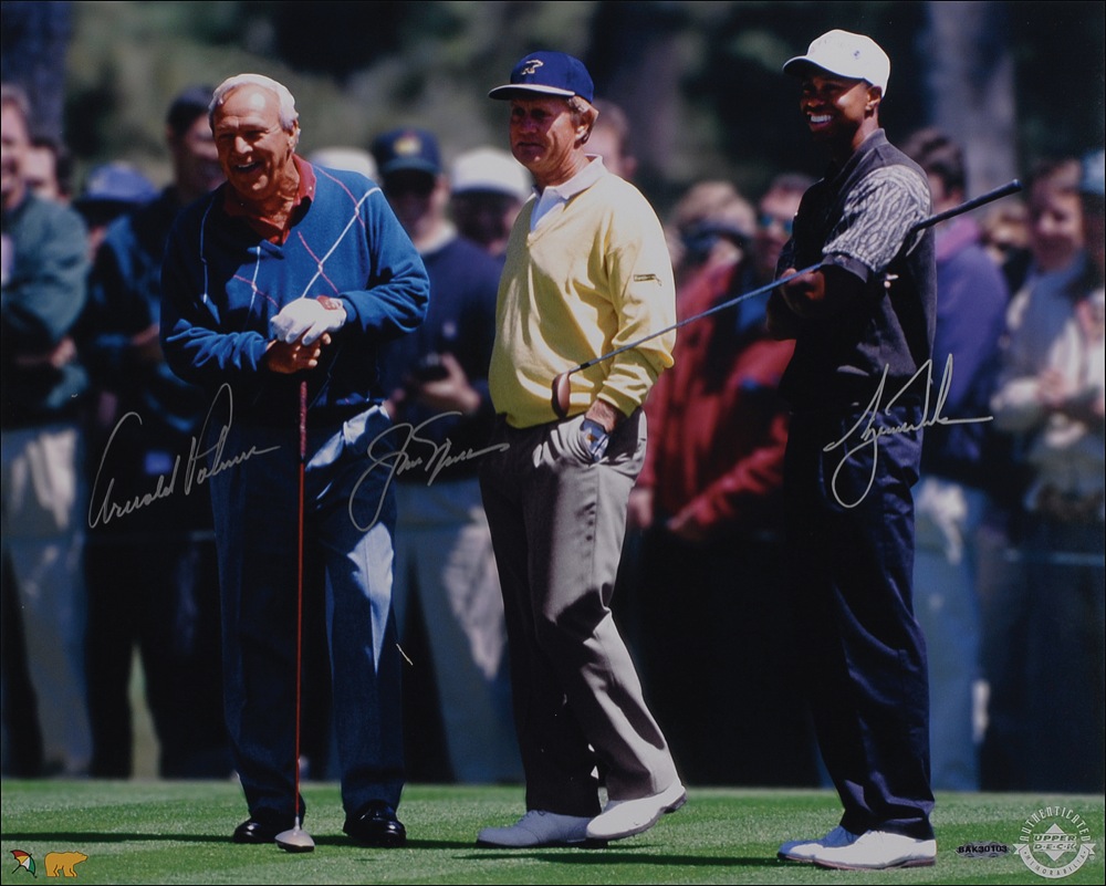 Fantastic satin-finish glossy 20 x 16 photo of Palmer, Nicklaus, and Woods posing together at the 1996 Masters Invitational, signed in silver ink by Tiger Woods, Arnold Palmer, and Jack Nicklaus. Accompanied by a certificate of authenticity from Upper Deck. In very fine condition. Pre-certified Steve Grad/PSA/DNA and RRAuction COA.