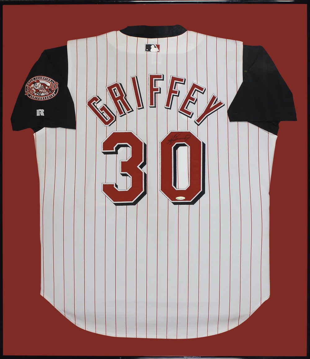 Official Russell replica Cincinnati Reds baseball jersey, with sewn on letters and numbers, signed in black felt tip on the number on the back. Framed to an overall size of 34.25 x 39.25. Accompanied by a certificate of authenticity from Upper Deck. In very fine condition. Oversized. Pre-certified Steve Grad/PSA/DNA and RRAuction COA.