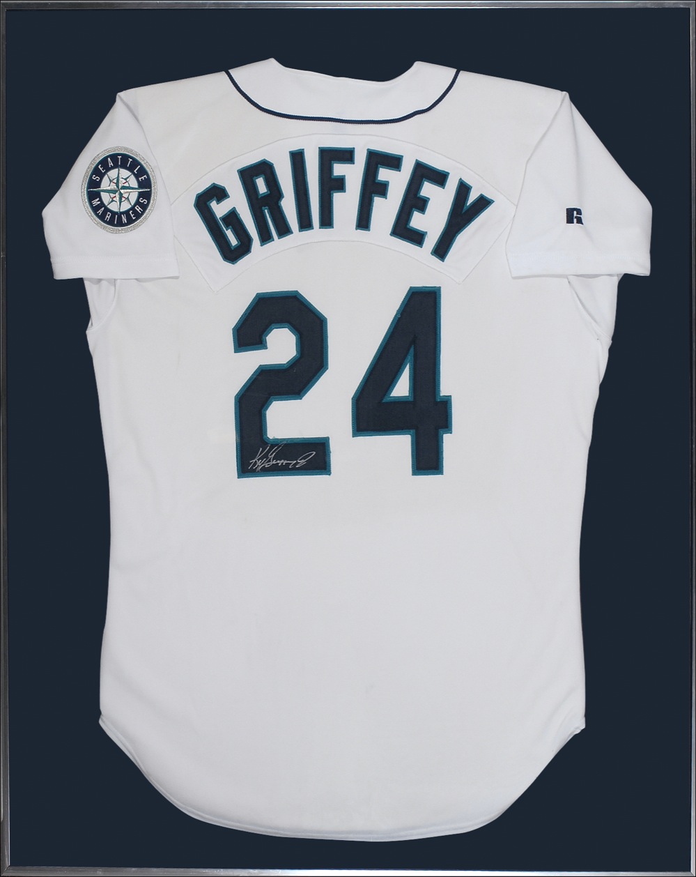 Official Russell replica Seattle Mariners baseball jersey, with sewn on letters and numbers, signed in silver ink on the number on the back. Framed to an overall size of 34.25 x 38. Accompanied by a certificate of authenticity from Upper Deck. In very fine condition. Oversized. Pre-certified Steve Grad/PSA/DNA and RRAuction COA.