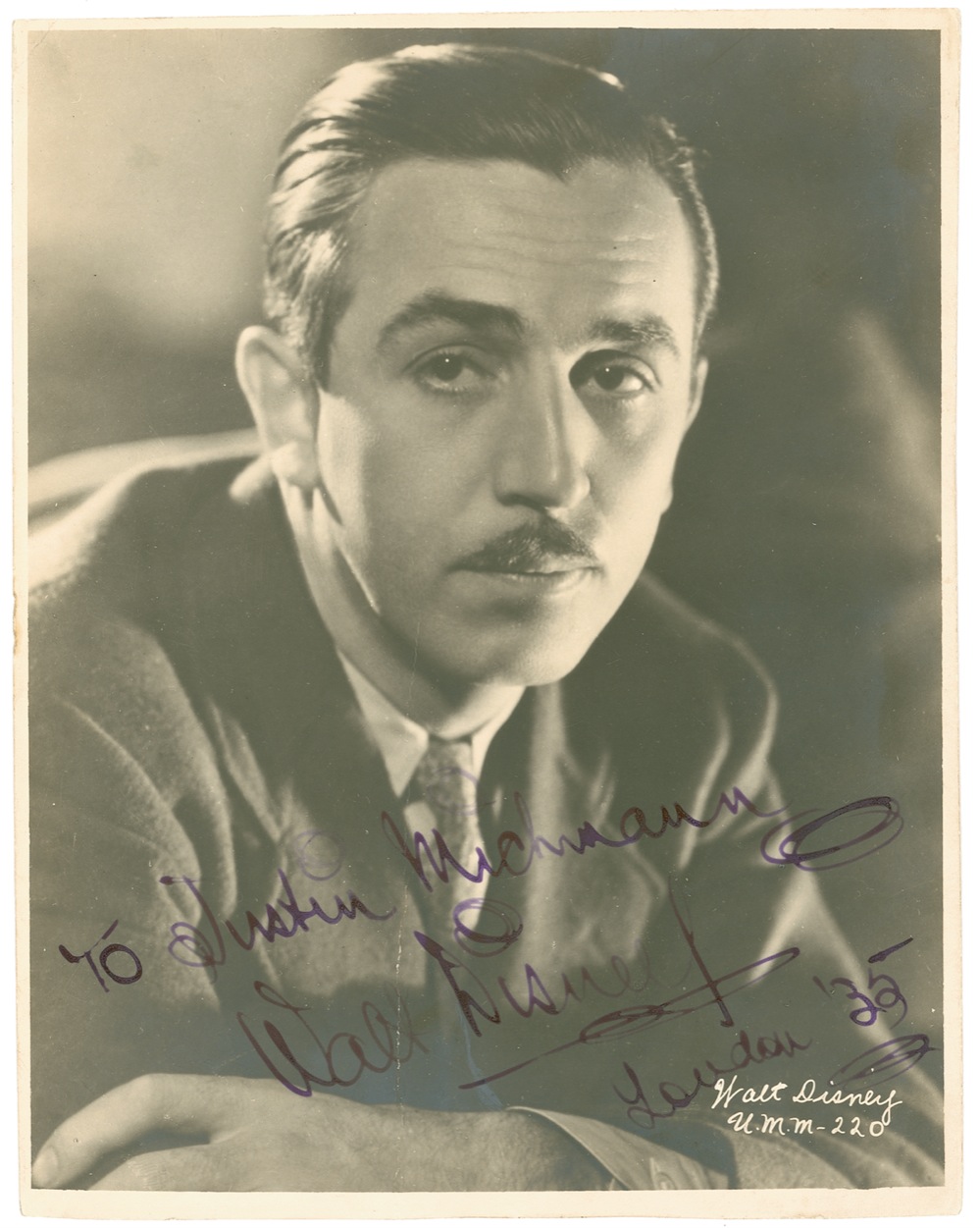 Vintage matte-finish 7 x 9 photo of a pensive-looking Disney, signed and inscribed in fountain pen, “To Justin Michmann, Walt Disney, London ‘35.” In very good condition, with a noticeable moderate vertical crease through portion of facial area and two letters of the signature, the end of the signature light but legible, a few trivial corner tip creases, and some light silvering to darker areas.