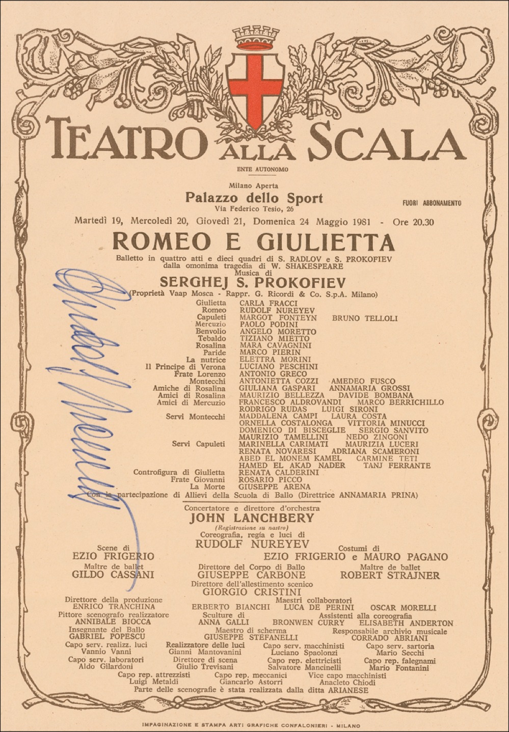 One page program, 6 x 9.5, for the Teatro alla Scala’s presentation of Romeo and Juliet, starring Nureyev and Margot Fonteyn, signed vertically in blue felt tip by Nureyev. In fine condition. RRAuction COA.