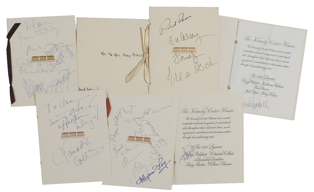 Six Kennedy Center Honors programs, ranging in date from 1987-1991, with a couple of duplicates, each signed on the cover or inside by respective recipients or attendees of the event, with some inscribing to Army Archerd. Signers include: Claudette Colbert, Mary Martin, Alexandra Danilova, Harry Belafonte, Vic Damone, Jessica Tandy, Hume Cronyn, Myrna Loy, George Burns, Robert Shaw, Gregory Peck, and Lauren Bacall. In fine overall condition. RRAuction COA.