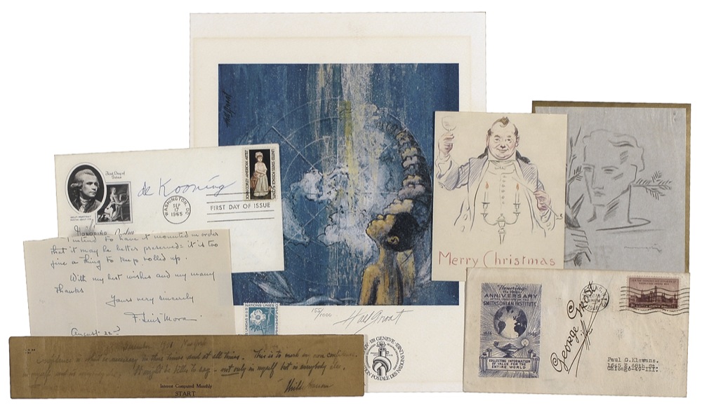 Seven items: an FDC signed in ballpoint by Willem de Kooning; a limited edition color 8.5 x 11 print signed in pencil by Hall Groat; a commemorative cover signed in fountain pen by George Grosz; an AQS, dated December 1931, by Childe Hassan; partial ALS from 1938 signed by F. Luis Mora; an original 1939 pencil sketch of a man holding a tree branch by Carter Morningstar; and a Christmas card signed by Emlen McConnell, with an original color pencil sketch on the front cover. In very good condition. RRAuction COA.
