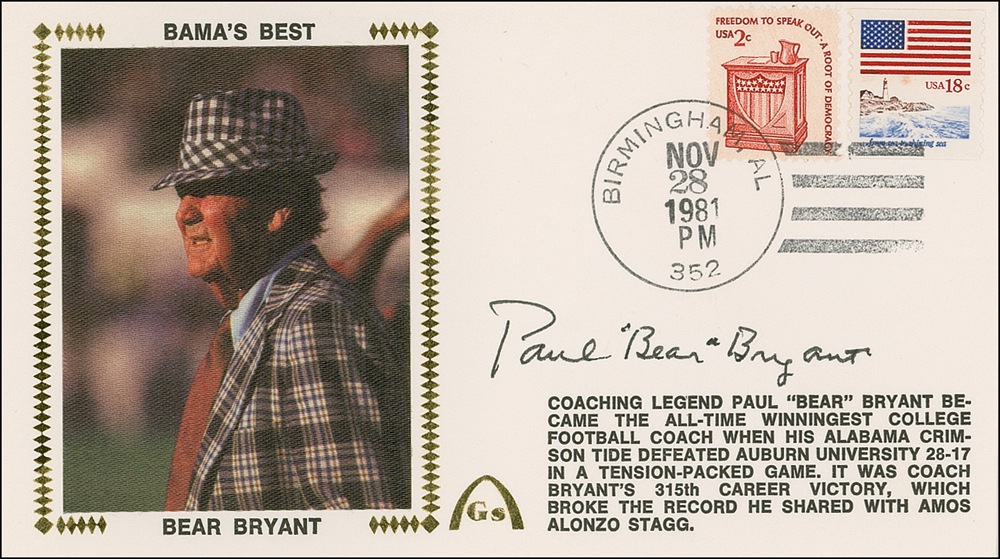 Gateway commemorative cover, bearing a color silk cachet honoring Bryant, signed on the front in black felt tip by Bryant. In very fine condition. Pre-certified Steve Grad/PSA/DNA and RRAuction COA.