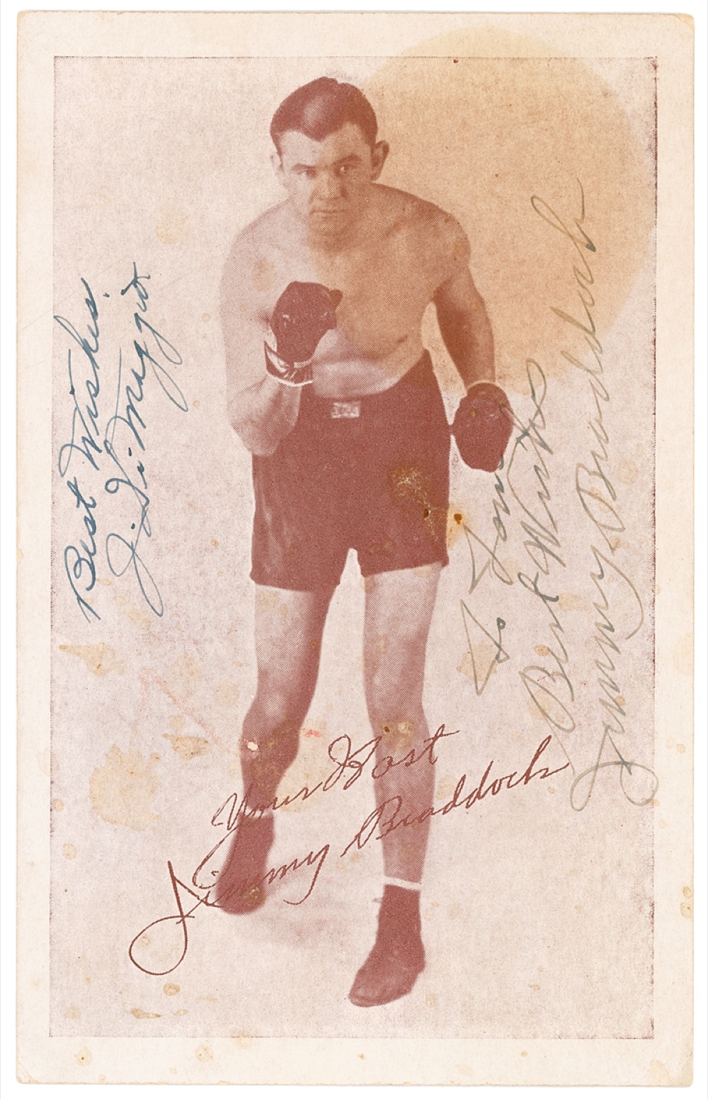 Vintage 3.5 x 5.5 Inn Braddock’s Corner postcard photo of Braddock striking a pugilistic pose, signed and inscribed in fountain pen “To Tom, Best wishes, Jimmy Braddock,” and “Best wishes, J. DiMaggio.” Photo also bears a facsimile signature and sentiment. In very good condition, with scattered light toning and spotting, with a heavier circle over portion of image (affecting appearance) and Braddock’s signature, and a small surface ding to center of image.