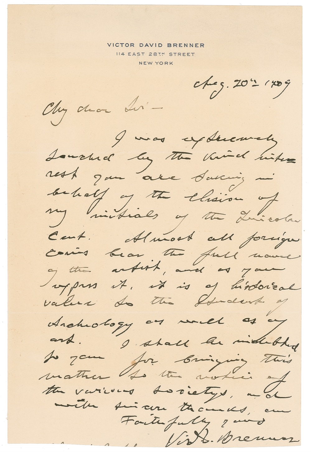 Russian-born American sculptor (1871–1924) best known as the designer of the Lincoln cent. Rare ALS signed “Victor Brenner,” one page, 5.5 x 8.25, personal letterhead, August 20, 1909. Letter to an unidentified gentleman. In part: “I was extremely touched by the kind interest you are taking on behalf of the elision of my initials of the Lincoln cent. Almost all foreign coins bear the full name of the artist, and as you express it, it is of historical value to the student of archeology as well as of art. I shall be indebted to you for bringing this matter to the notice of the various societies.” In fine condition, with a slightly irregulaly-trimmed lower edge.