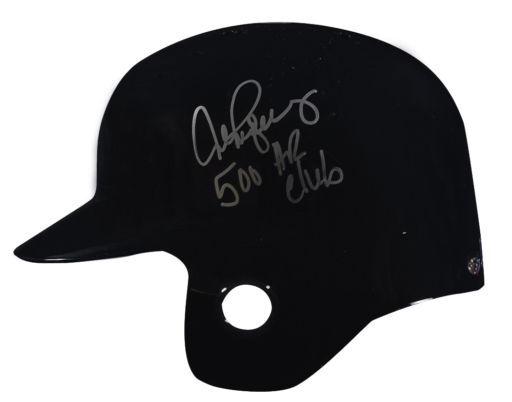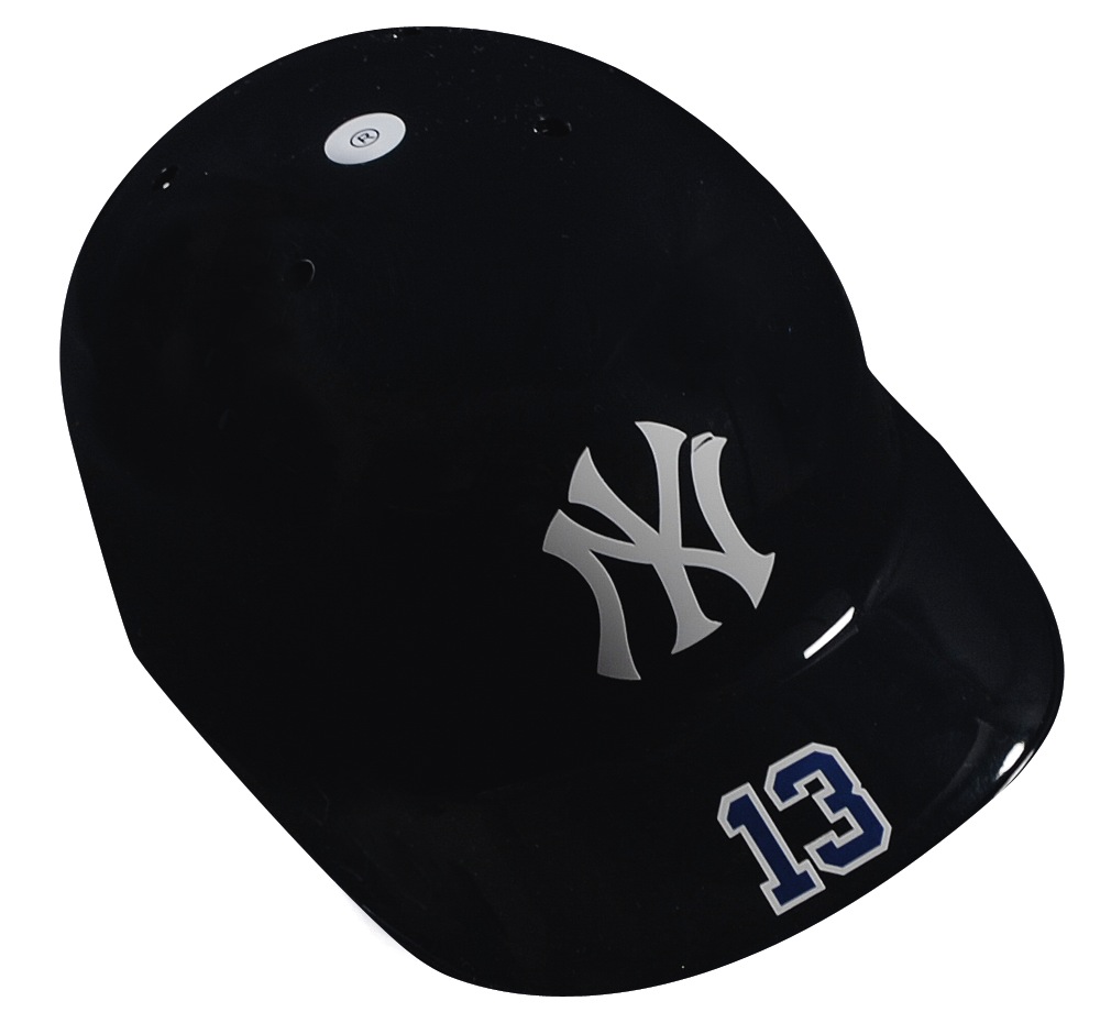 Official Rawlings New York Yankees fitted baseball batting helmet, size 7 1/8, with Yankees emblem on the front and Rodriguez’s number 13 on the brim, signed in silver ink on the side, “Alex Rodriguez, 500 Home Run Club.” In very fine condition, with a Major League Baseball hologram affixed inside of helmet. Pre-certified Steve Grad/PSA/DNA and RRAuction COA.