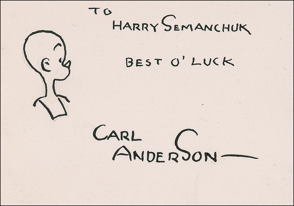 Original vintage signed and inscribed ink sketch of Henry on an off-white 3.5 x 2.5 card, signed and inscribed “To Harry Semanchuk, Best o’ luck, Carl Anderson.” In very fine condition. RRAuction COA.