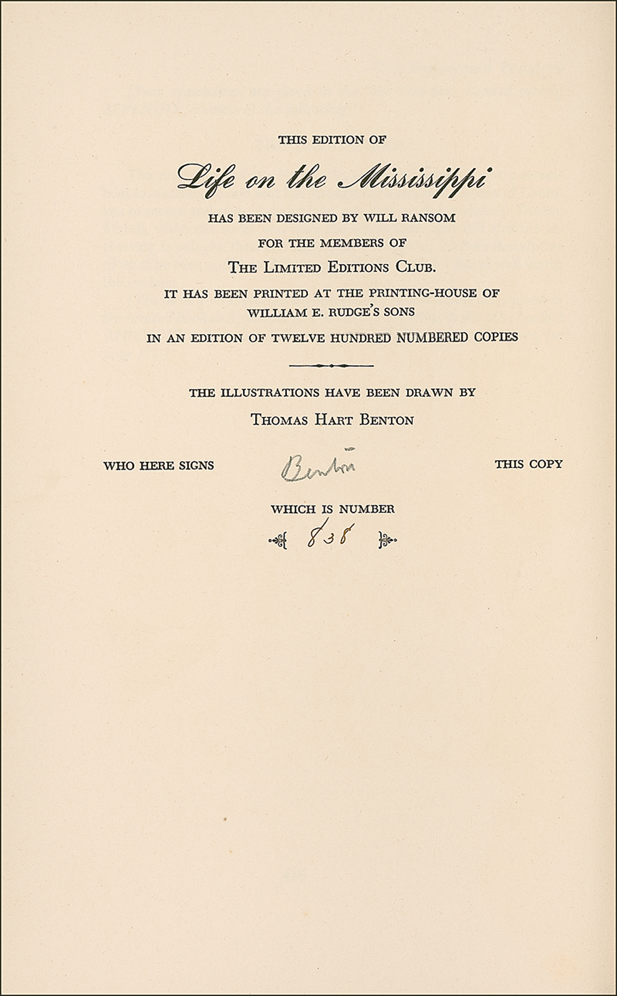 Signed book: Life on the Mississippi. Later printing. NY: Limited Editions Club, 1944. Hardcover with dustjacket, 6.5 x 9.745, 418 pages. Signed in pencil, “Benton,” on the colophon page indicating this is number 838 of a limited edition of 1200. Some light wear and toning to covers, a bit of light toning to title page, sunning and wear to label on spine of box, as well as some scattered light wear, otherwise fine condition. RRAuction COA.