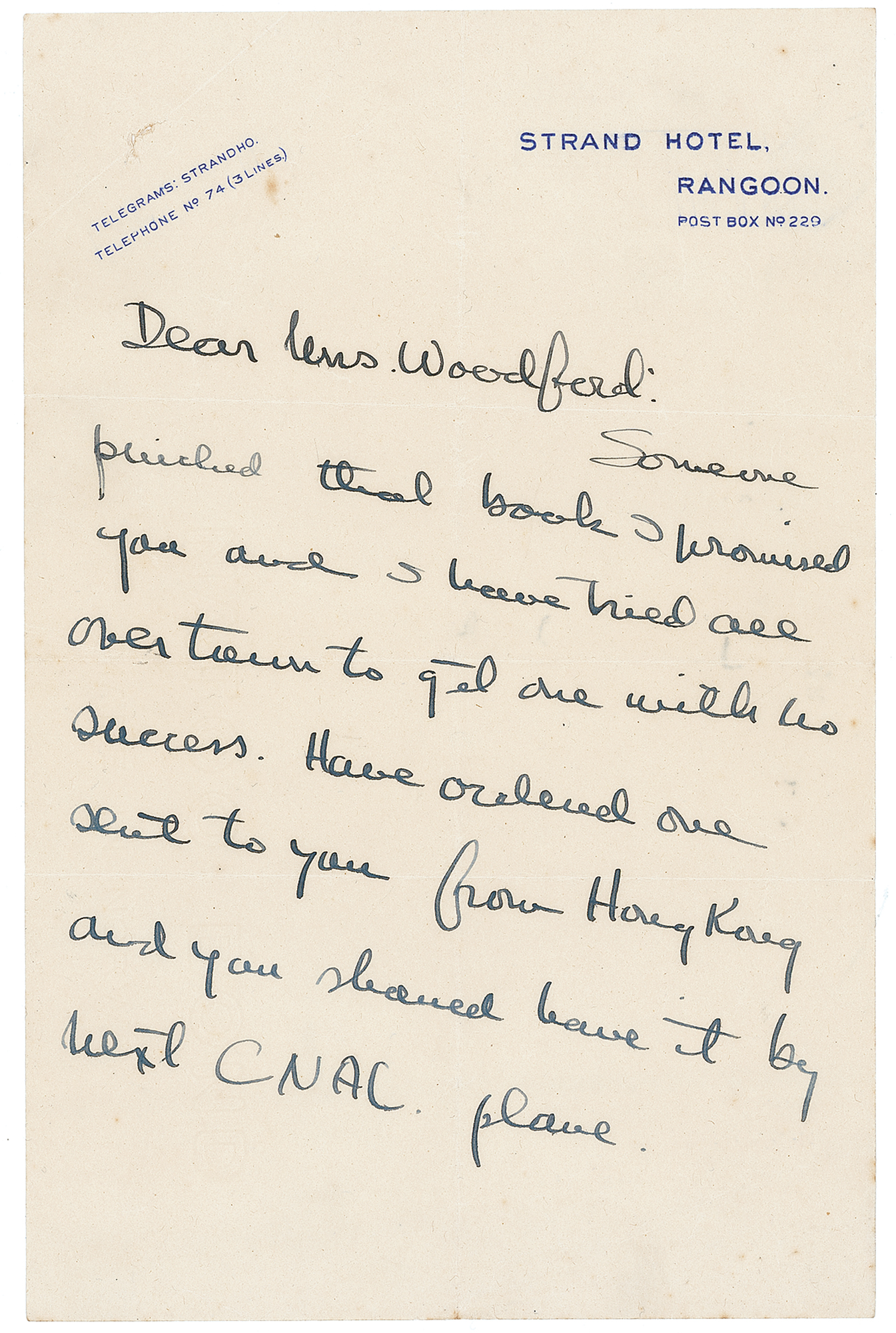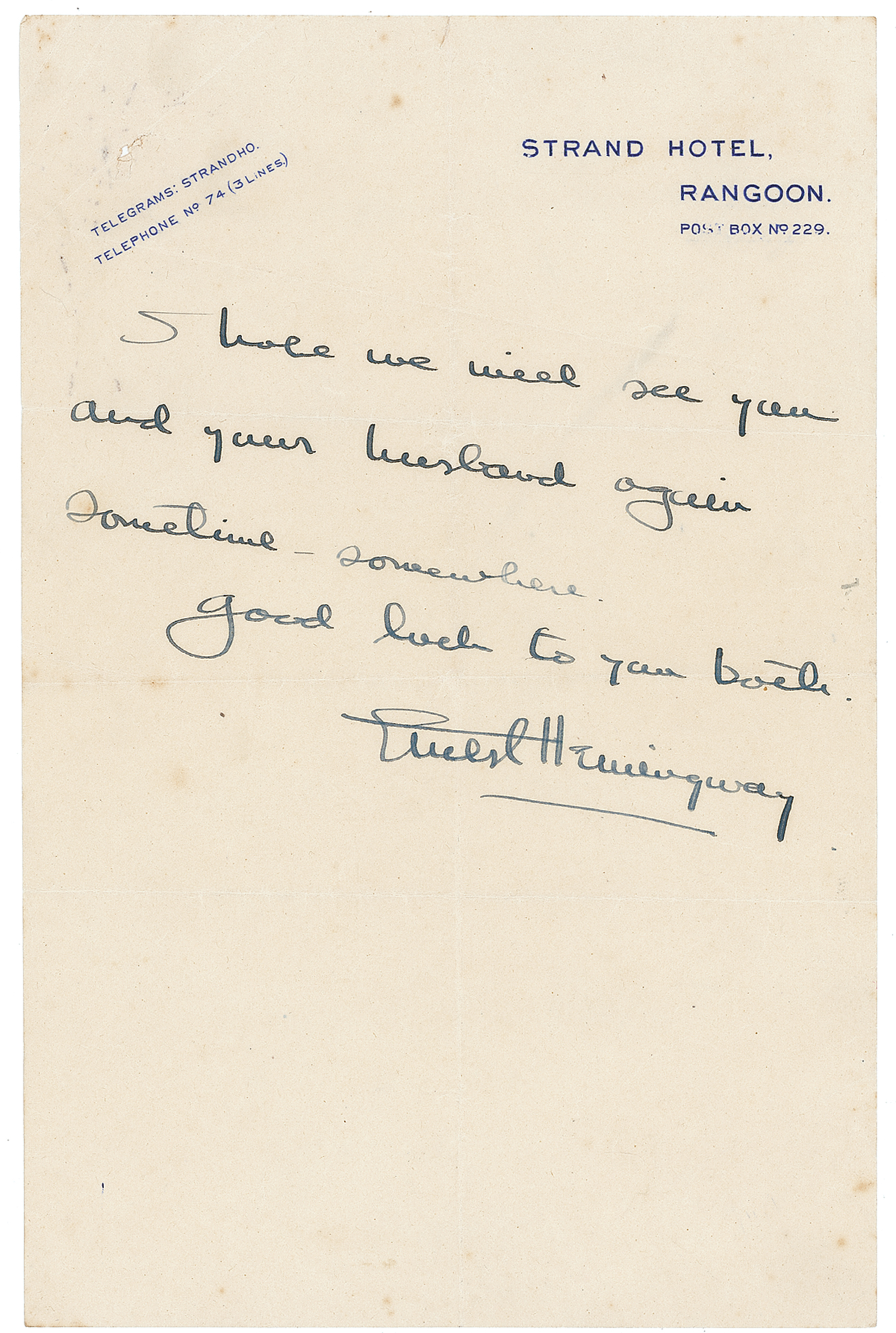 ALS, two pages, 5.75 x 8.75, Strand Hotel, Rangoon, no date [circa 1941]. Hemingway writes to Mrs. Woodford, apologizing for not sending a book and writing that he has ordered one to be sent from Hong Kong. In full: “Someone pinched that book I promised you and I have tried all over town to get one with no success. Have ordered one sent to you from Hong Kong and you should have it by next CNAC plane. I hope we will see you and your husband again sometime – somewhere.” In very good condition, with several intersecting moderate mailing folds and creases (one fold through portion of first name), some trivial light foxing, and staple holes to top left corners. Hemingway’s writing and signature are very bold.