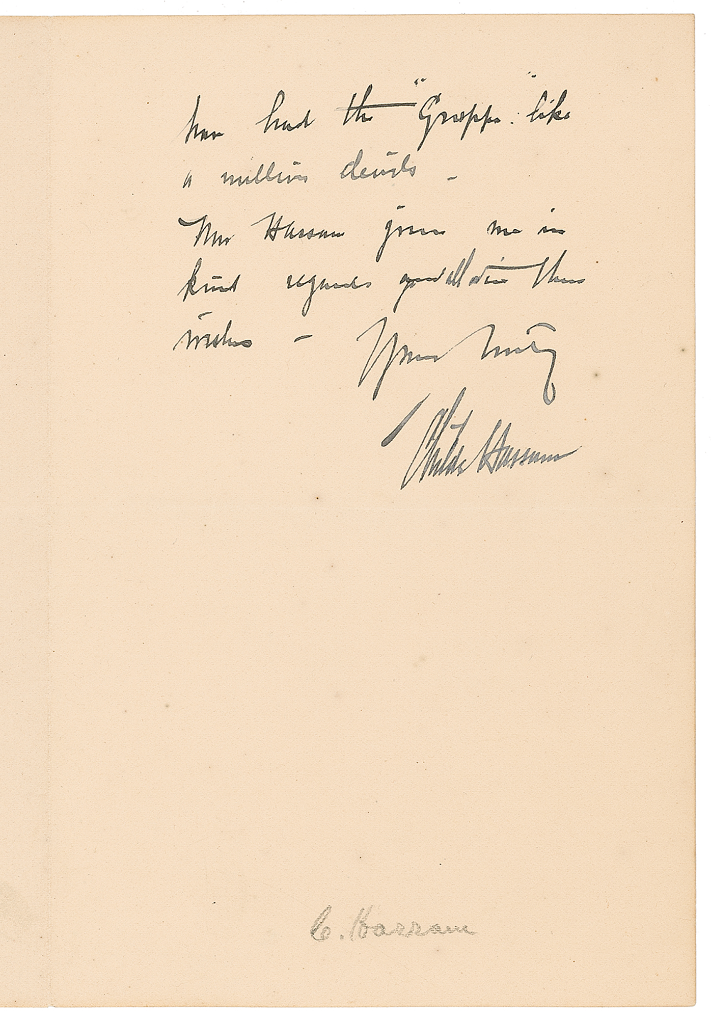 Highly regarded American artist (1859–1935) best known for his impressionistic landscapes and evocative views of New York City; his best-known works include paintings of flag-draped skyscraper “canyons” in that city. ALS, two pages on two adjoining sheets, 4.5 x 7, January 30. Letter addressed to Thomas. In part: “We should have you here with us but Mrs. Hassam’ sister Mrs. Cotton is with us…If she goes before you come to N.Y. you must stay with us, so come up here when you come out. I have had the ‘Grupps’ like a million devils.” Pencil notation to bottom of second page, and moderate toning and foxing to first page, otherwise fine condition. Pre-certified PSA/DNA and RRAuction COA.