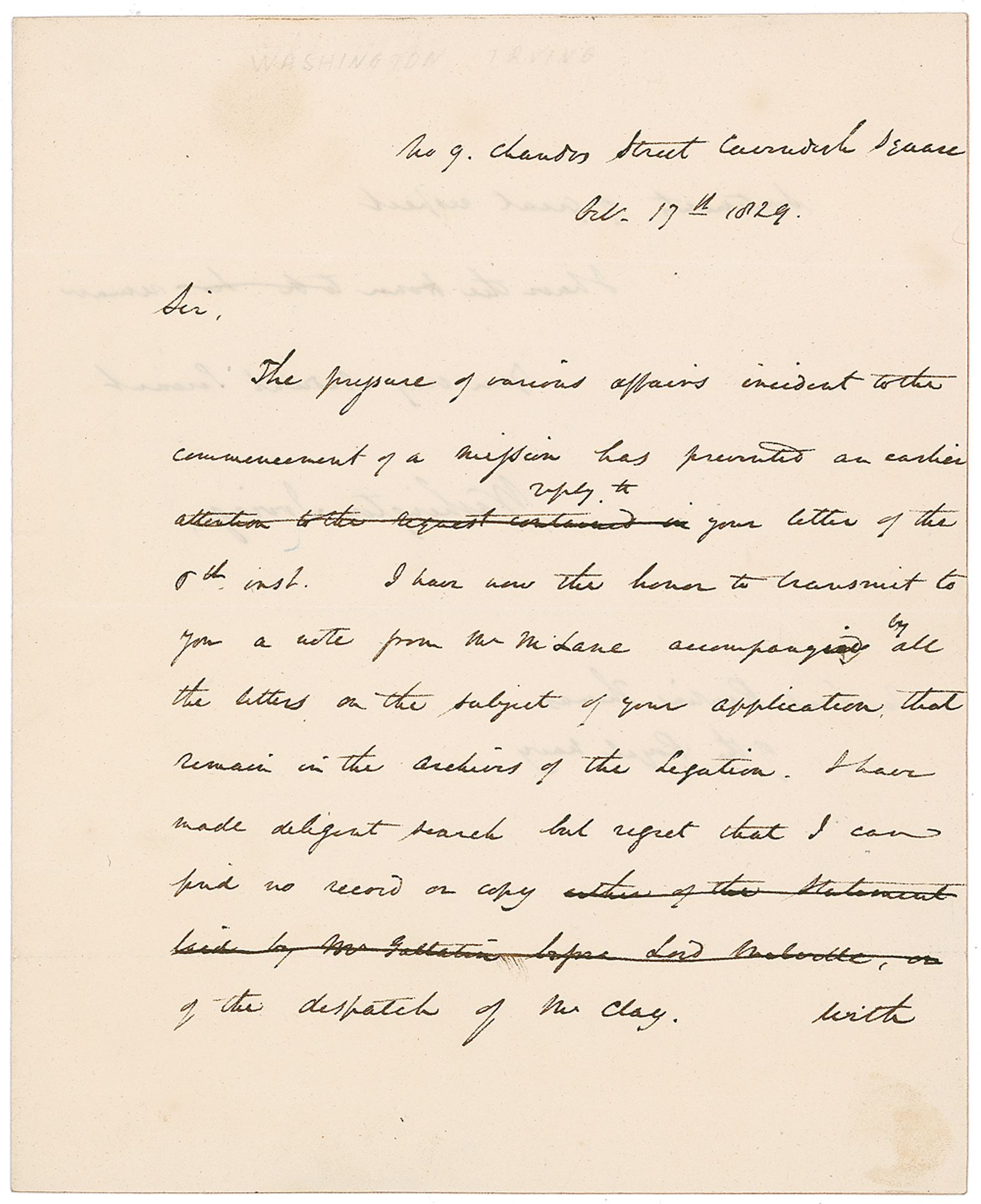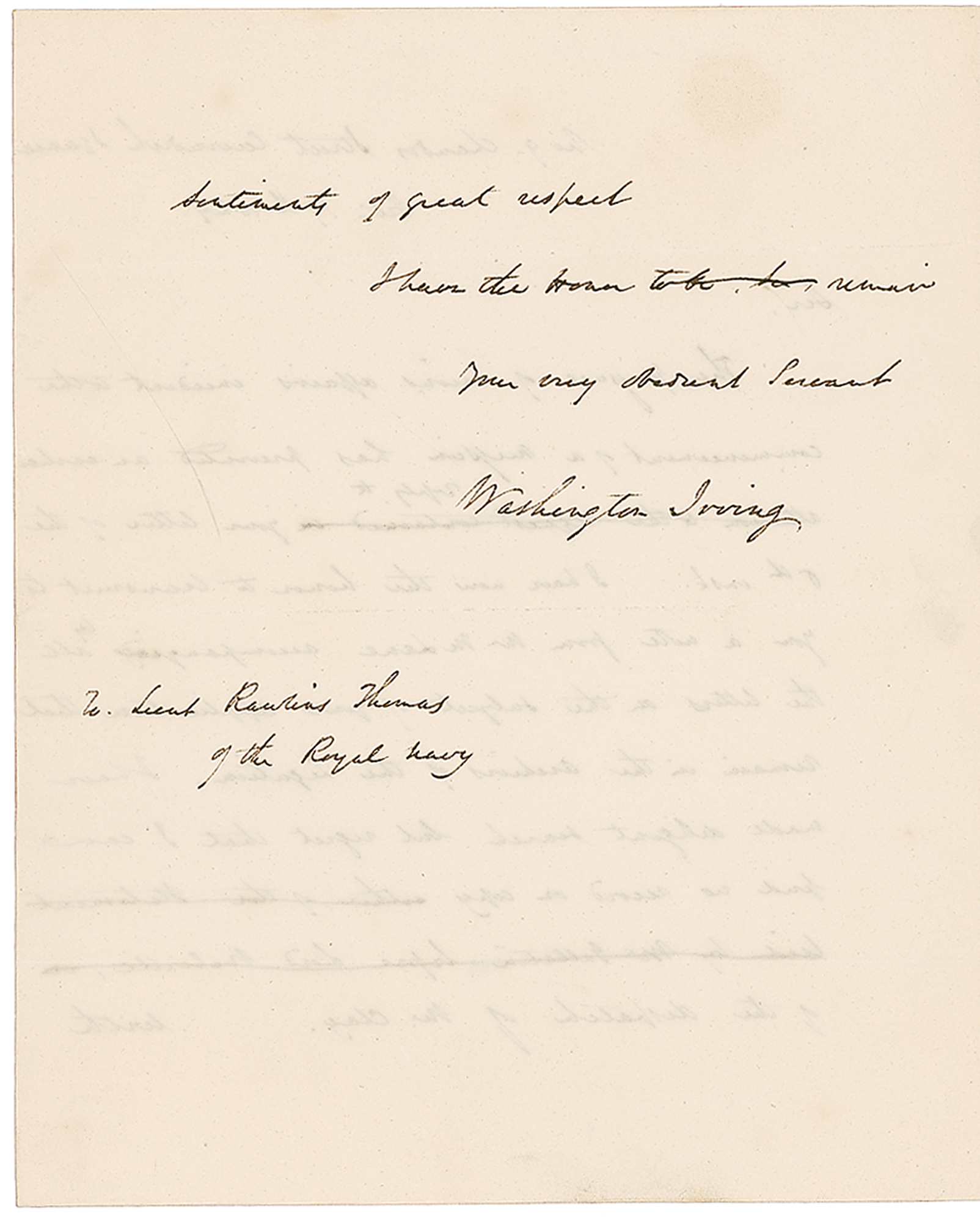 American author (1783–1859) best known for his stories “The Legend of Sleepy Hollow” and “Rip Van Winkle.” ALS, written as a member of the American Legation to Britain, one page both sides, 7.25 x 9, October 17, 1829. Letter to Lieutenant Rawlins Thomas of the Royal Navy. In part: “The pressure of various affairs incident to the commencement of a mission has prevented an earlier reply to your letter…I have the honor to transmit to you a note from Mr. Lane accompanying all the letters on the subject of your application…I have made diligent search but regret that I can find no record or copy of the dispatch of Mr. Clay.” In fine condition, with light pencil notation at top, and a bit of mild toning. Pre-certified PSA/DNA and RRAuction COA.