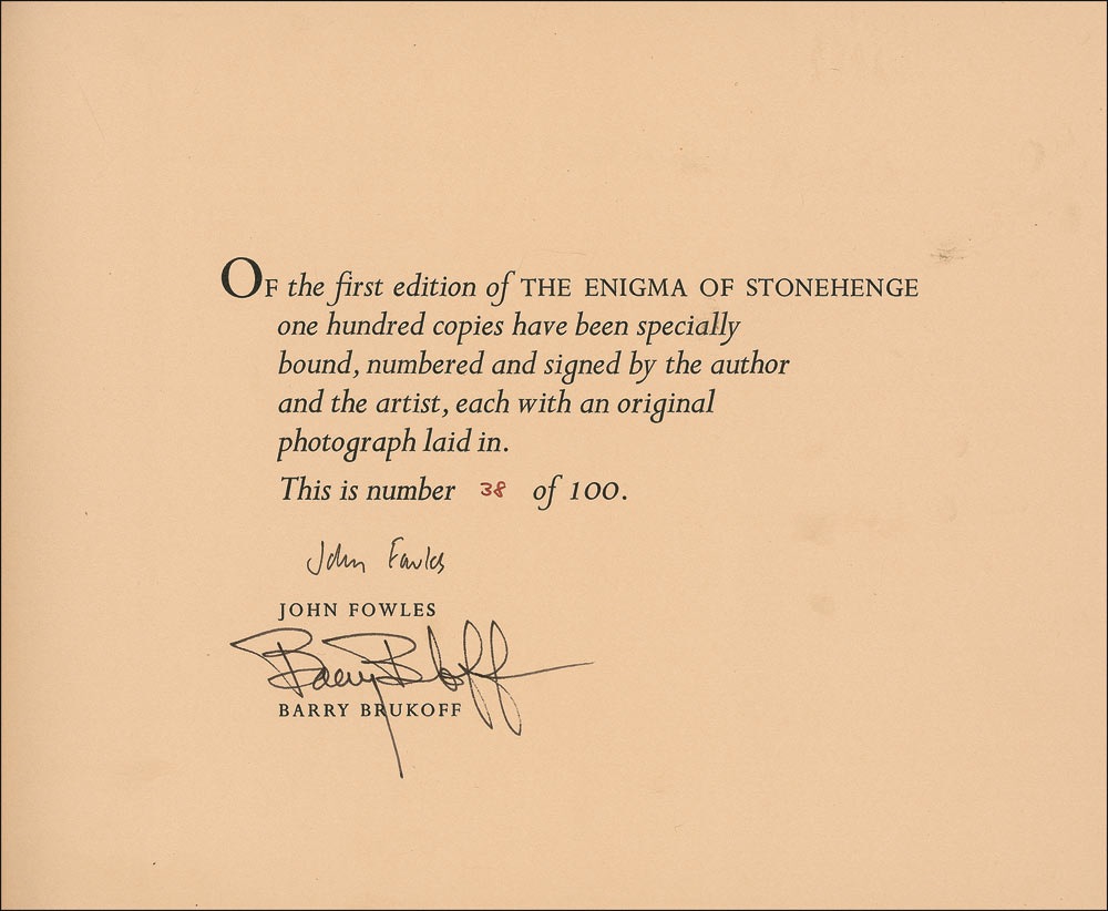 Signed book: The Enigma of Stonehenge. Special limited first edition. London: Jonathan Cape, 1980. Hardcover with slipcase, 10 x 8.25, 126 pages. Signed on the limitations page, indicating this is a special edition of 100 signed copies (this being #38), by John Fowles and Barry Brukoff. Accompanied by the corresponding limited edition 10 x 8 color photo of Stonehenge, signed in the lower border by Brukoff. In fine condition. RRAuction COA.