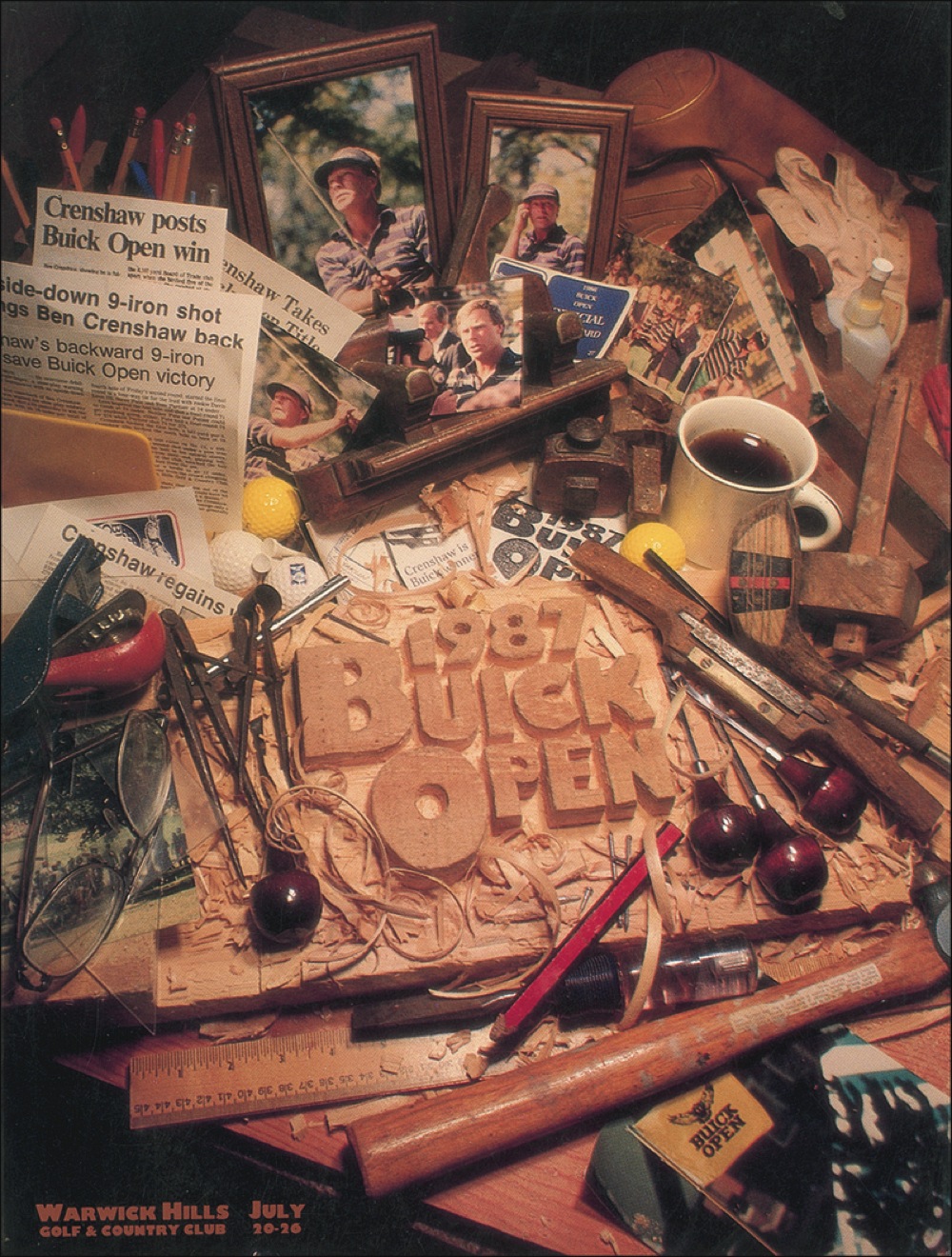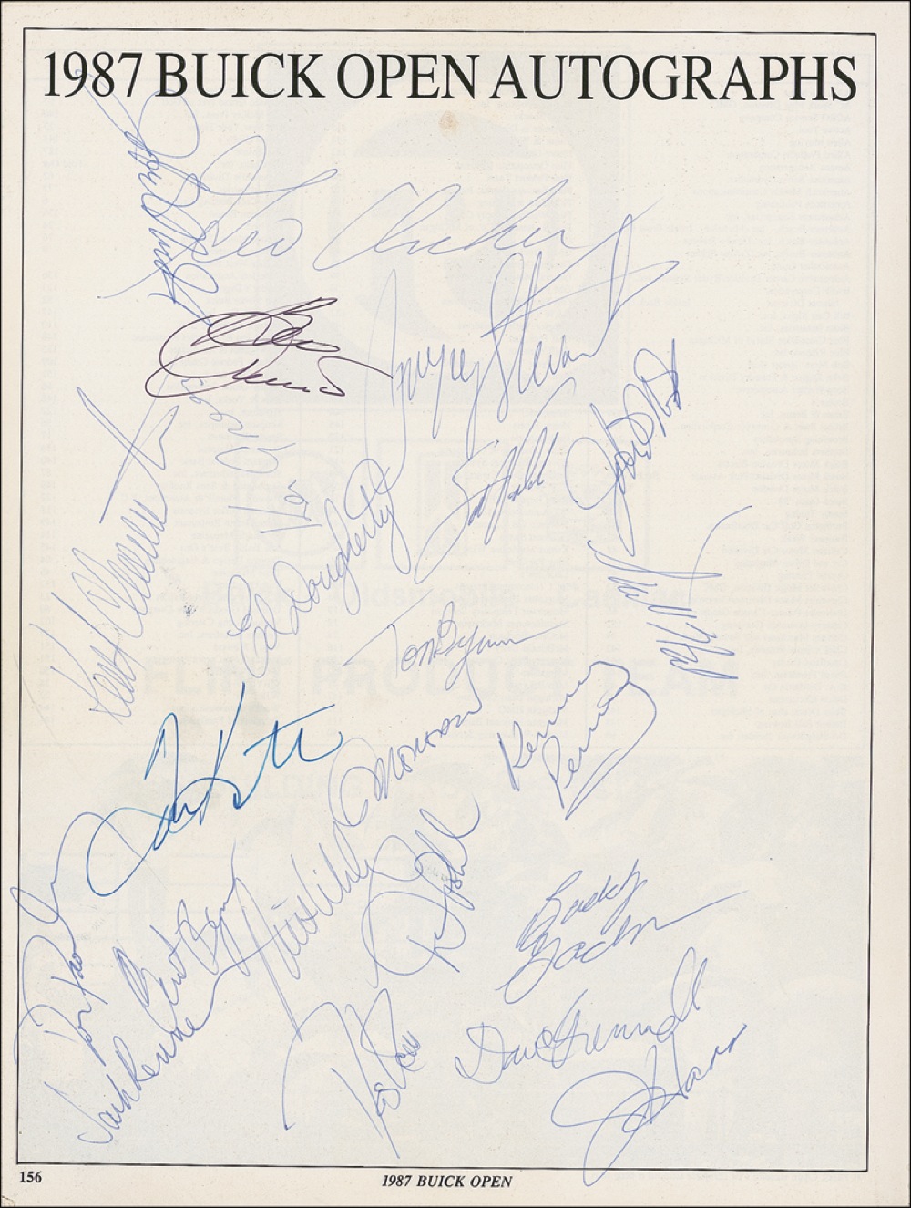 Program from the 1987 Buick Open, 8.5 x 11, 156 pages. Signed in ballpoint on the last page by 20 participants in the tournament: Payne Stewart, John Inman, Ben Crenshaw, Scott Verplank, Ed Dougherty, Keith Clearwater, Curt Byrum, Tom Byrum, Ray Floyd, John Adams, Dave Rummells, Jack Renner, Kenny Perry, Jay Haas, Buddy Gardner, Tom Kite, Jodie Mudd, Ken Green, Scott Hoch, and David Pohl. In fine condition, with cover hinges a bit fragile, and small tear to spine. Pre-certified Steve Grad/PSA/DNA and RRAuction COA.
