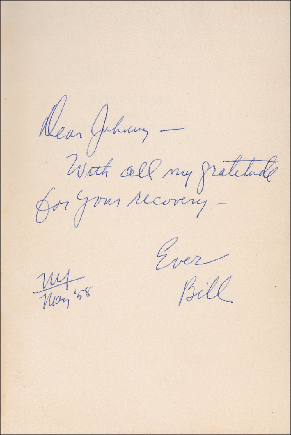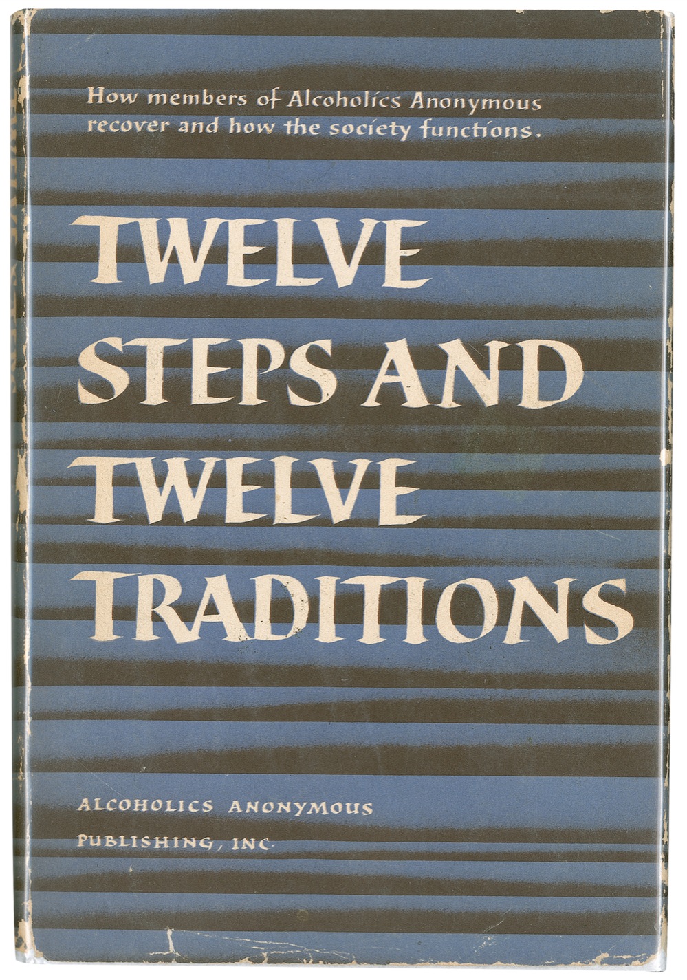 Signed book: Twelve Steps and Twelve Traditions. Later printing. Alcoholics Anonymous Publishing, Inc., 1953. Hardcover with dustjacket, 5.75 x 8.5, 192 pages. Signed and inscribed in blue ballpoint on the first free end page, “Dear Johnny—With all my gratitude for your recovery—Ever, Bill, NY, May ‘58.” This “other” Big Book, Wilson’s appropriately anonymous follow-up to the historic Alcoholics Anonymous (1939), contains a detailed discussion of the program’s famous twelve steps, as well as the “twelve traditions” that were codified during the group’s formative years. In fine condition, with scattered toning and foxing to inside pasteboards, and some scattered wear and creases to dustjacket and spine. A handsome copy of a title uncommon in signed examples. Pre-certified PSA/DNA and RRAuction COA.