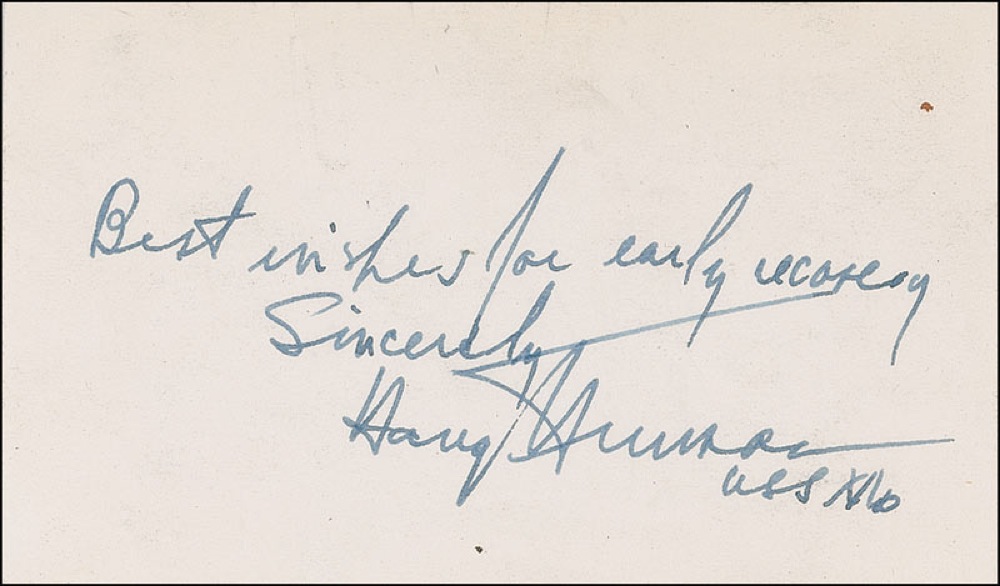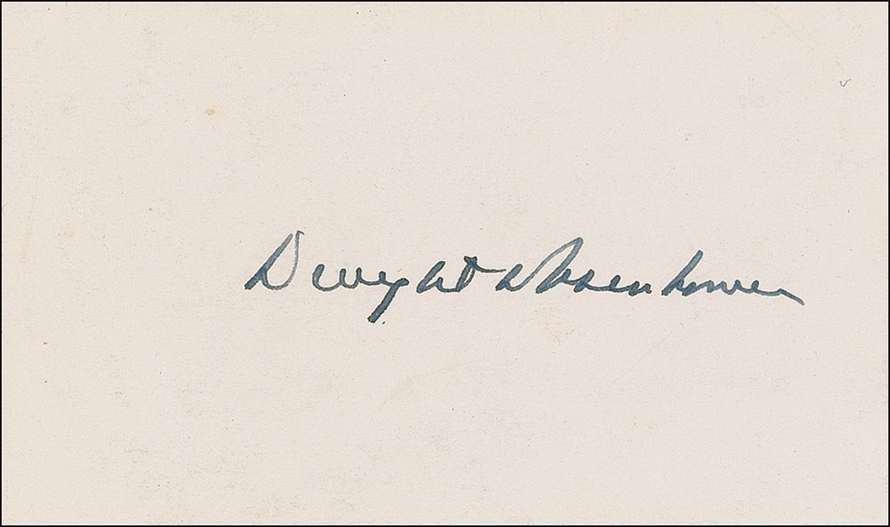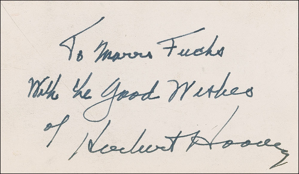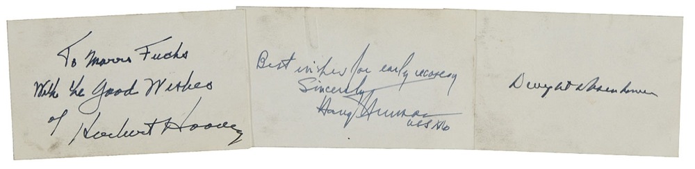 Ink signatures of Herbert Hoover, Harry S. Truman, and Dwight D. Eisenhower on individual off-white 4 x 2.5 cards. Hoover adds a brief inscription, and Truman adds a short sentiment. In fine condition, with a paperclip impression to top of Truman’s card. RRAuction COA.