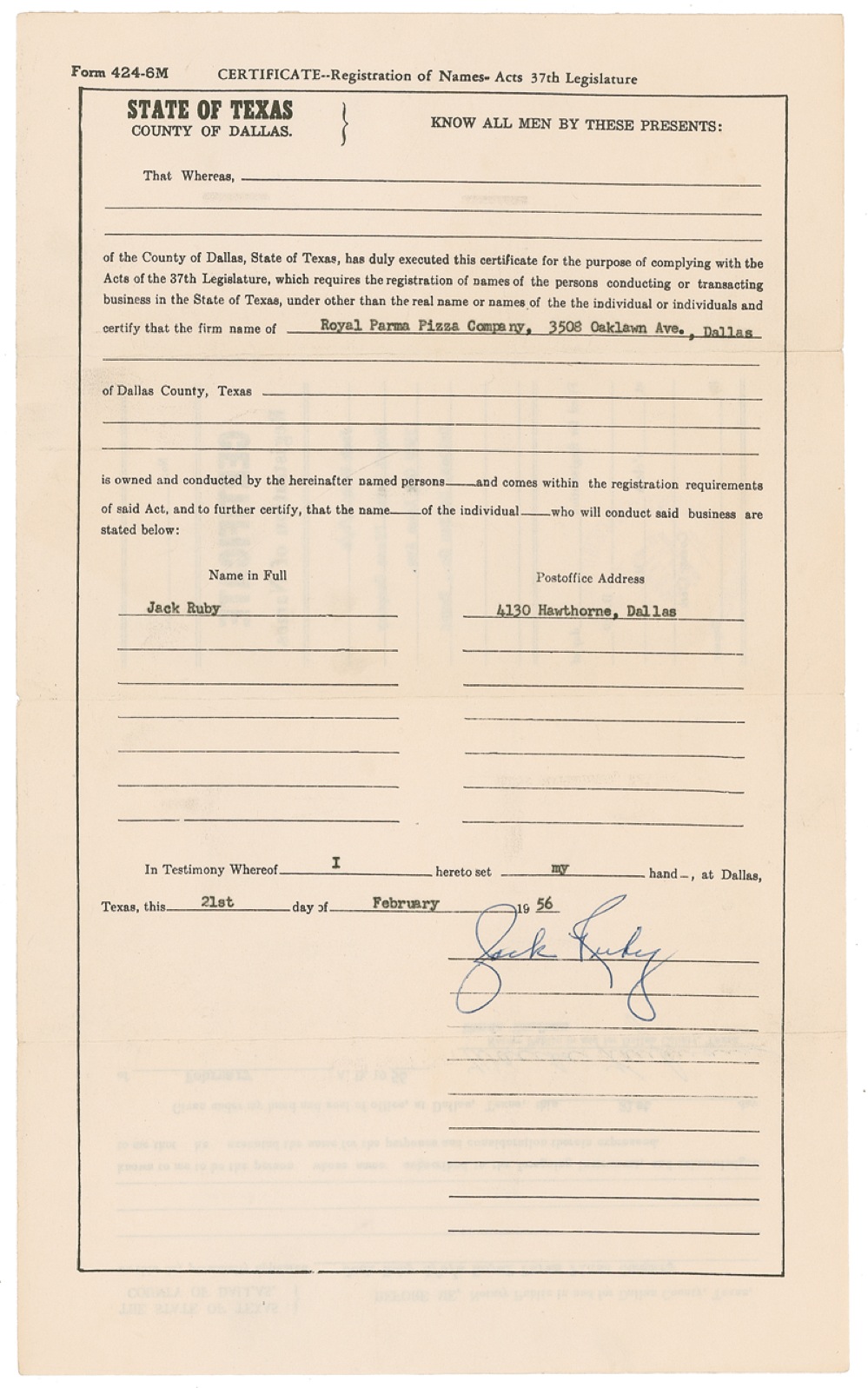 Notarized DS, one page, 8.5 x 14, February 21, 1956. Texas certificate for registration of names. In part: “The County of Dallas, State of Texas, has duly executed this certificate for the purpose of complying with the Acts of the 37th Legislature, which requires the registration of names of the persons conducting or transacting business in the State of Texas, under other than the real name or names of the individual…and certify that the firm name of Royal Parma Pizza Company, 3508 Oaklawn Ave., Dallas …is owned and conducted by the hereinafter named persons – Jack Ruby 4130 Hawthorne, Dallas.” In fine condition, with expected folds. Pre-certified PSA/DNA and RRAuction COA.