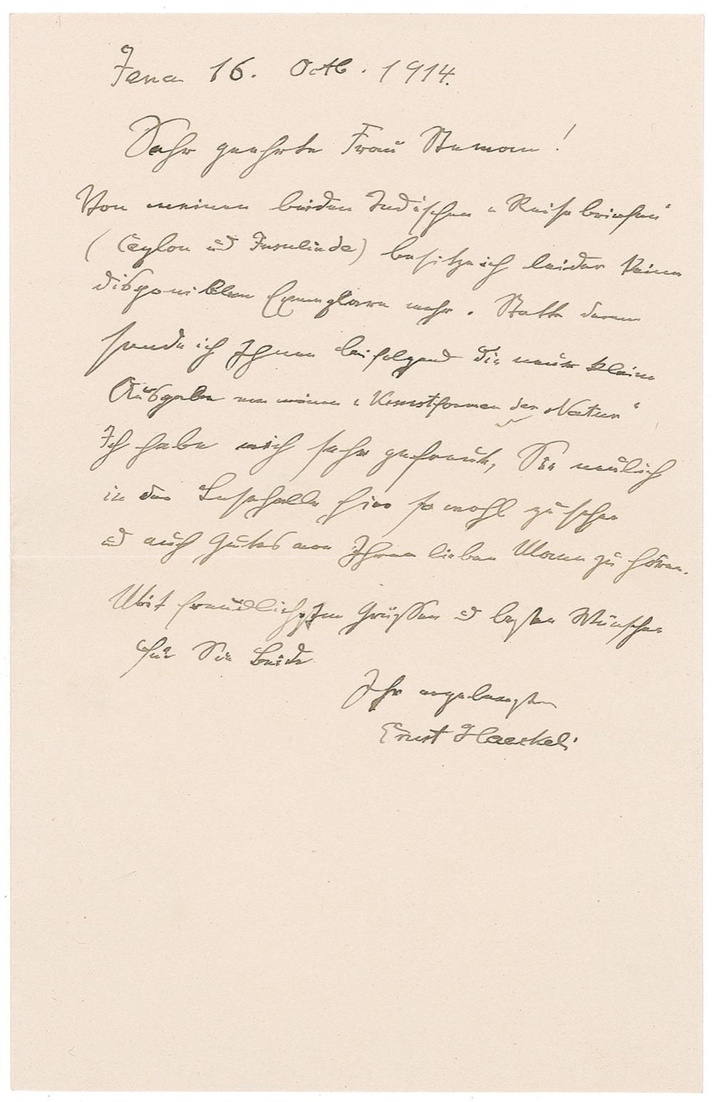 Influential German evolutionist, morphologist, and developmental biologist (1834–1919). ALS in German, one page, 5.75 x 8.75, October 16, 1914. Letter to Frau Steman, to whom he sent a copy of his “Kunstformen der Natur.” In part (translated): “About my both Indian Travel letters (Ceylon and Insulinde) I have no copies to give away.” In fine condition. RRAuction COA.