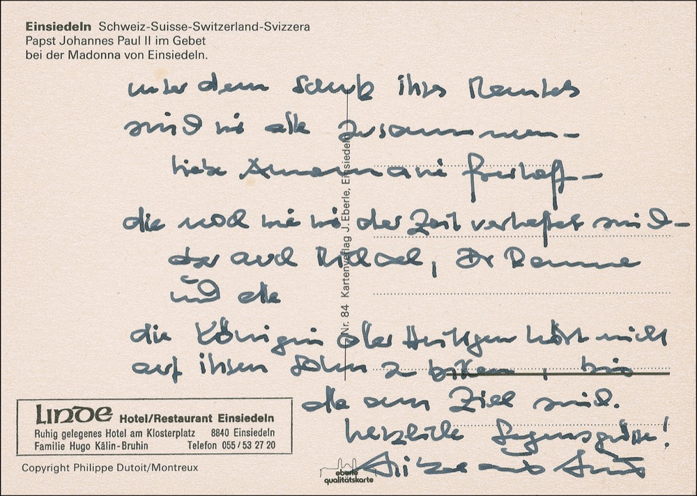 Color 4.25 x 5.75 postcard photo of the Pope in prayer at Our Lady of Einsiedeln in Switzerland, signed in blue ink, “Joannes Paulus PP. II.” Reverse bears either an untranslated letter or collector’s notation in another hand. Light to moderate contrast to signature, heavier towards the end, and some scattered light surface marks and dings, otherwise fine condition. Pre-certified PSA/DNA and RRAuction COA.