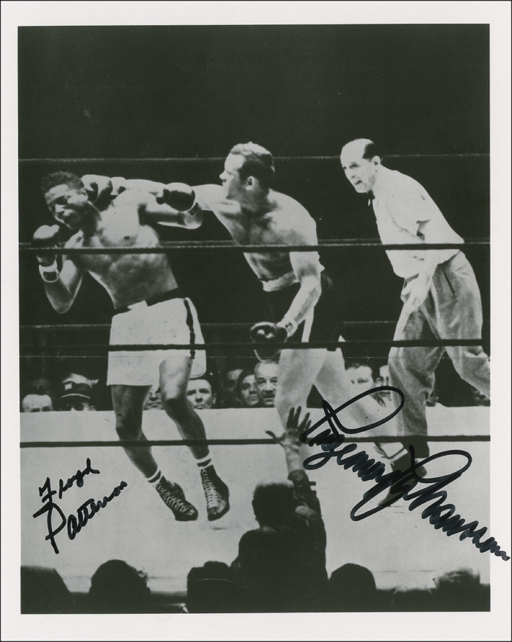 Glossy 8 x 10 photo of Patterson being decked by Johannson, signed in black felt tip by both. In very fine condition. Pre-certified Steve Grad/PSA/DNA and RRAuction COA.