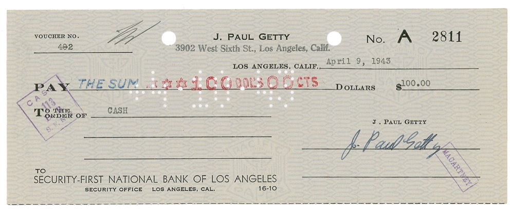 Personal check, 8.5 x 3.5, filled out in type and signed by Getty, payable to Cash for $100.00, April 9, 1943. In fine condition, with expected stamps and holes, with one stamp directly under signature, and punch holes to top edge. RRAuction COA.