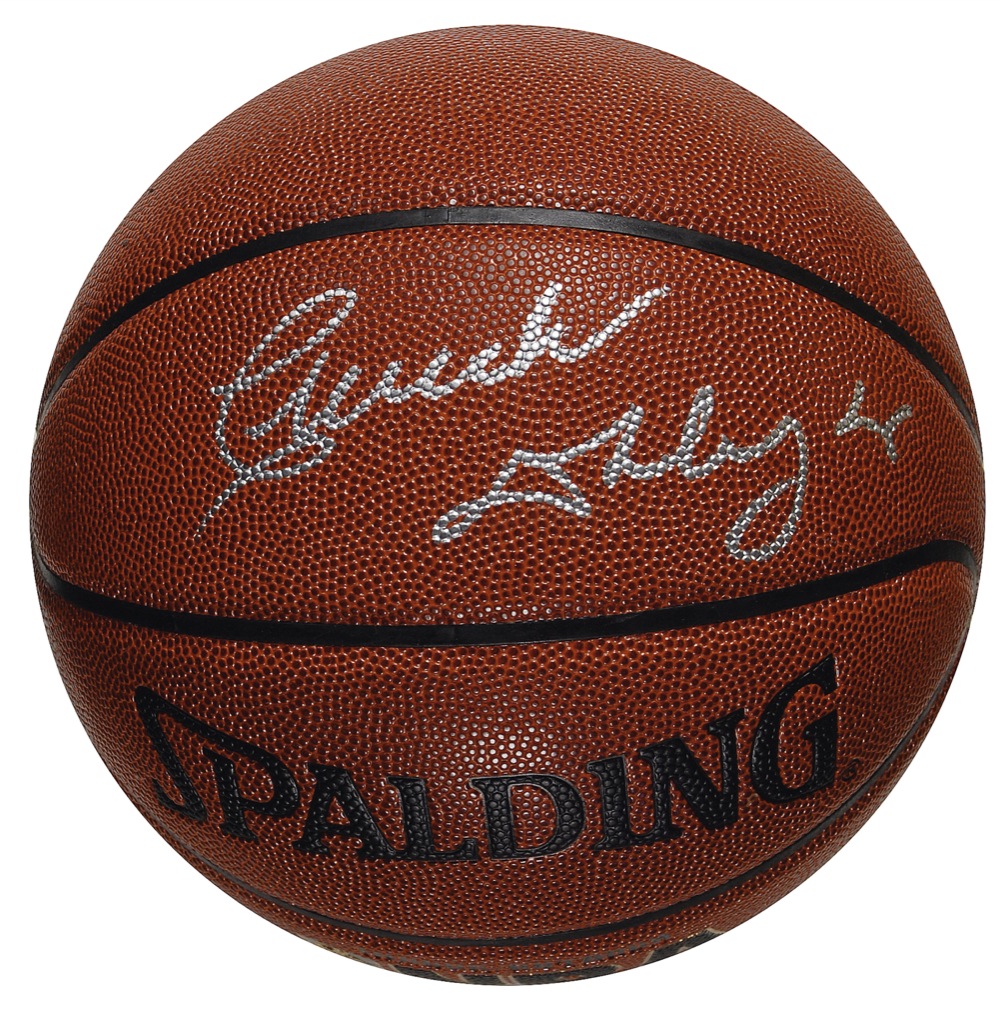 Official Spalding NBA basketball signed in silver ink on a side panel. Accompanied by the original Steiner glass presentation case and box. In very fine condition. Pre-certified Steve Grad/PSA/DNA and RRAuction COA.