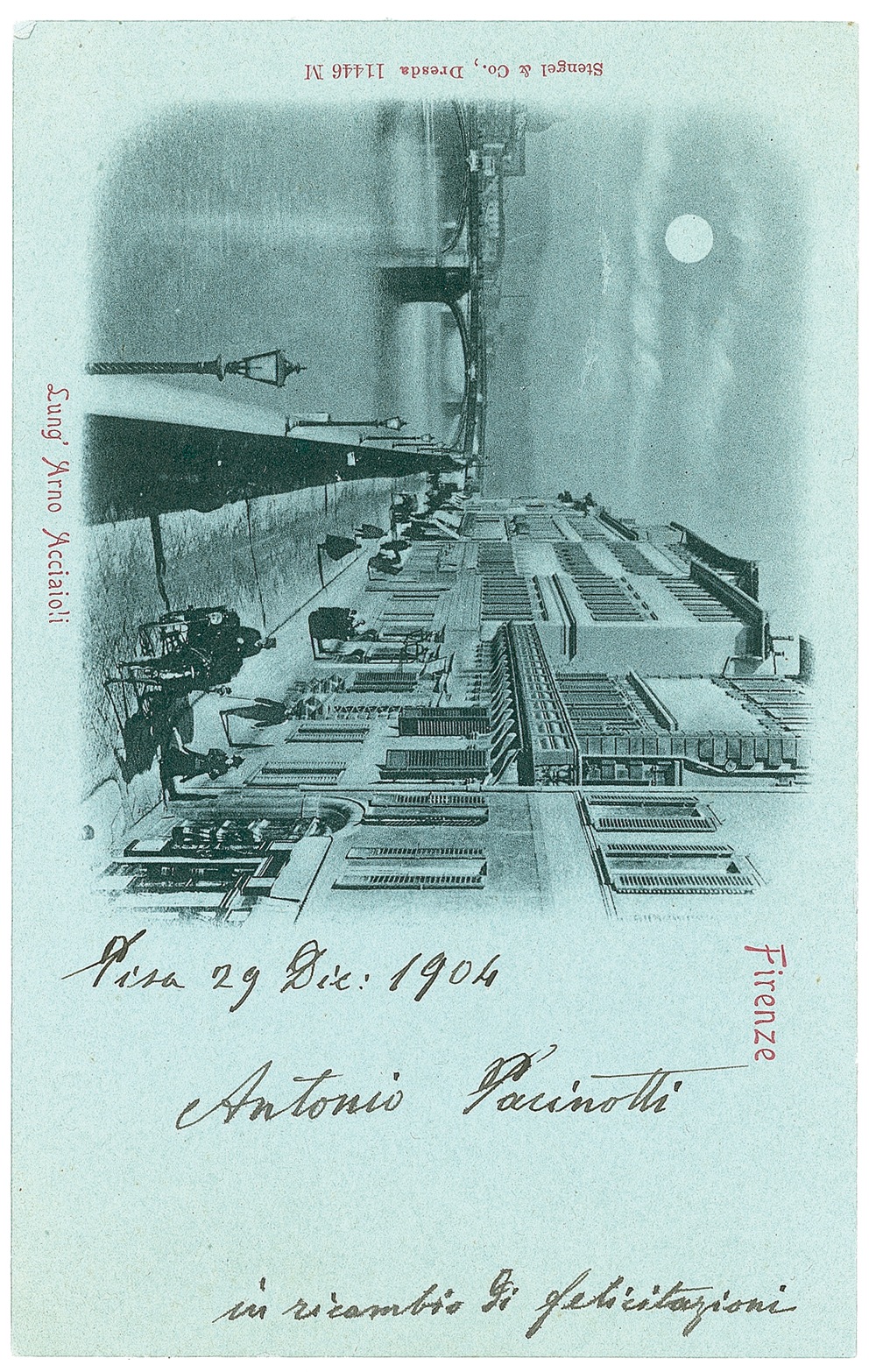 Italian physicist (1841-1912) best known for inventing an improved form of direct-current electrical generator, or dynamo. Picture postcard with a vignette of a river walkway, signed vertically in the right border, “Pisa, 29 Dec: 1906, Antonio Pacinotti,” adding a short Italian sentiment under signature. In fine condition. RRAuction COA.