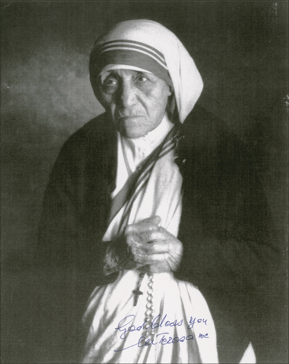 Matte-finish 8 x 10 photo of Mother Teresa clutching her rosary, signed in blue ink, “God bless you, M. Teresa mc.” In fine condition. Pre-certified PSA/DNA and RRAuction COA.