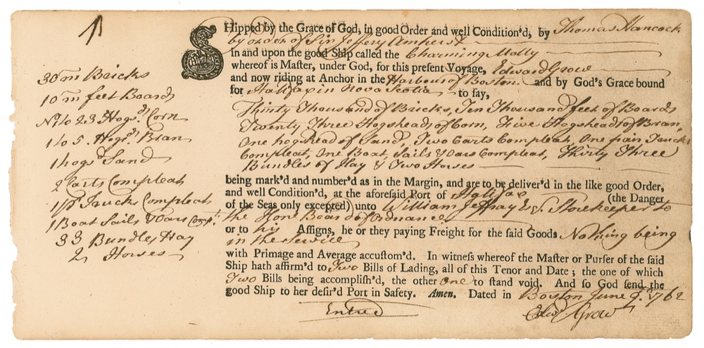 Partly printed unsigned DS filled out in Hancock’s hand (and including his surname “Hancock”), one page, 9.25 x 4.5, June 9, 1762. A bill of lading. In part: “Shipped by the Grace of God, in good Order and well Condition’d, by Thomas Hancock by order of Sir Jeffrey Amherst in and upon the good Ship called the Charming Molly whereof is Master, under God, for this present Voyage, Edward Grove and now riding at Anchor in the Harbour of Boston and by God’s Grace bound for Halifax Nova Scotia to say, Thirty Thousand of Bricks, Ten Thousand feet of Boards, Twenty Three Hogsheads of Corn, Five Hogsheads of Bran, One Hogshead of Sand, Two Carts Compleat, One pair Trucks Compleat, One Boat, Sails & Oars Compleat, Thirty Three bundles of Hay & Two Horses.” Light toning and soiling, heavier to right side, and creasing and chipping to left edge, otherwise fine condition. Pre-certified John Reznikoff/PSA/DNA and RRAuction COA.