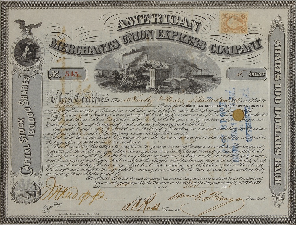 Partly-printed DS, signed “Wm. F. Fargo,” one page, 11.5 x 9, December 15, 1868. A certificate for five shares of stock in the American Merchants Union Express Company issued to Hawley & Cady, signed at the bottom by Wells as president of the company. Double matted and framed to an overall size of 17.25 x 14.5. A couple light vertical creases, one through a single letter of signature, stamp and cancellation hole to body, and some scattered toning from writing on reverse, otherwise fine condition. Pre-certified PSA/DNA and RRAuction COA.