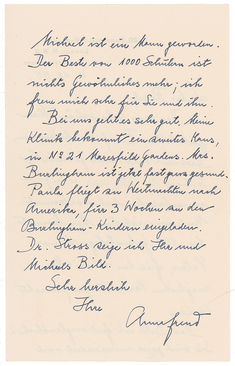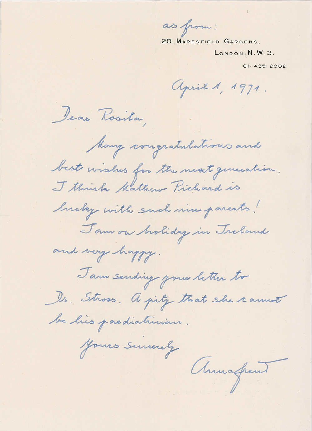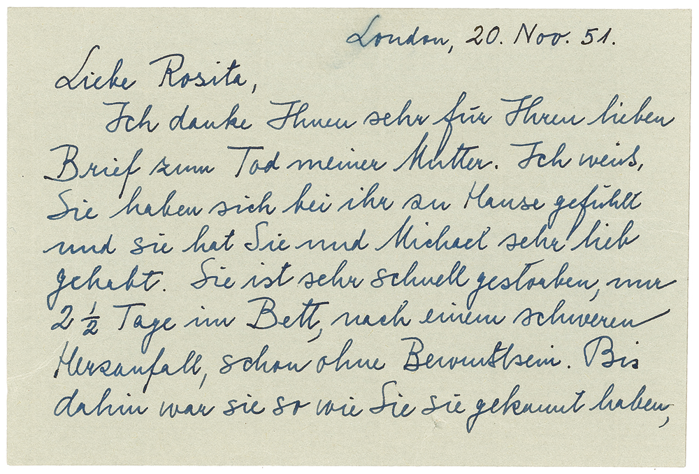 Daughter of Sigmund Freud (1895–1982) and pioneer in the psychoanalysis of children. Collection of 13 ALSs, both in letter and postcard form, all in German, ranging in date from November 20, 1951, through 1 April 1971. Altogether 30 pages in various formats, and including 10 hand-addressed envelopes. All are written to Rosita Grünberg, an acquaintance from her Viennese days. The correspondence begins with the death of Anna Freud’s mother.November 20, 1951: “I know you felt at home with her, and she loved you and Michael [Rosita’s son] most dearly. She died very quickly, only 2 1/2 days in bed, after a severe heart attack, without consciousness. Up until then she was as you knew her, active as always, somewhat weaker perhaps. She was greatly pained by the lessening of her eyesight, which greatly hampered reading and writing.”
