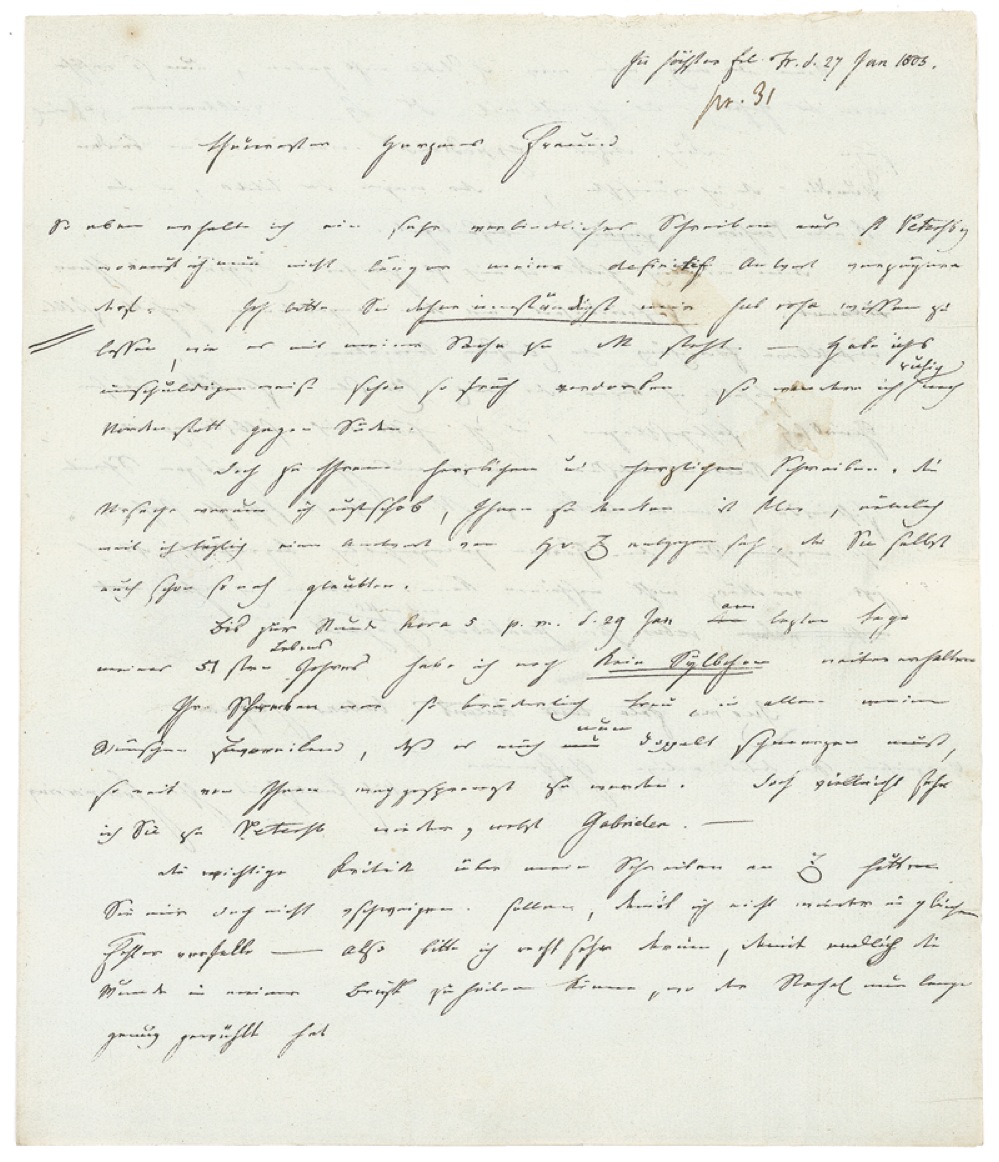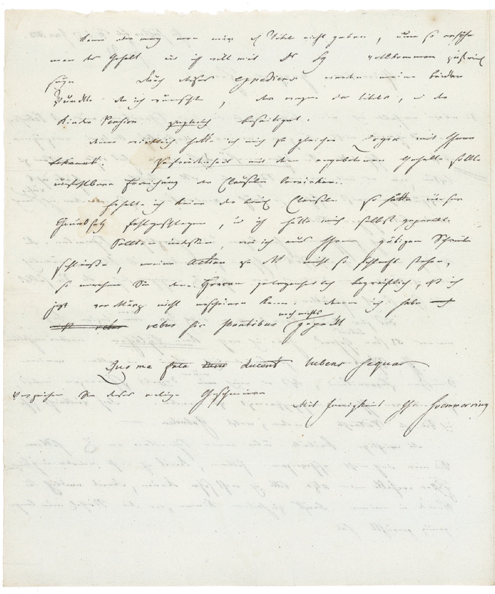 ALS in German, one page both sides, 7.5 x 9, January 27, 1805. Letter to Heinrich Wilhelm Karl von Harnier, the Royal Prussian Resident in Munich, regarding his pending appointment to the Bavarian Academy of Sciences. He informs Harnier that he has just received a most genial letter from St. Petersburg which requires an immediate answer, for which reason he must know how matters stand in Munich. In case he has spoiled his chances there, he will be happy to move North rather than South. He adds that Harnier’s letter was of such remarkable fidelity that he would be doubly pained to be so far removed from him though perhaps they will meet again in St. Petersburg. In March, Soemmerring was to accept his appointment to the Bavarian Academy of Sciences in Munich. Second integral page bears an address panel in another hand, as well as a red wax seal. In fine condition, with intersecting mailing folds, areas of light toning and wrinkling, and unobtrusive show-through from Soemmerring’s text on the reverse. RRAuction COA.