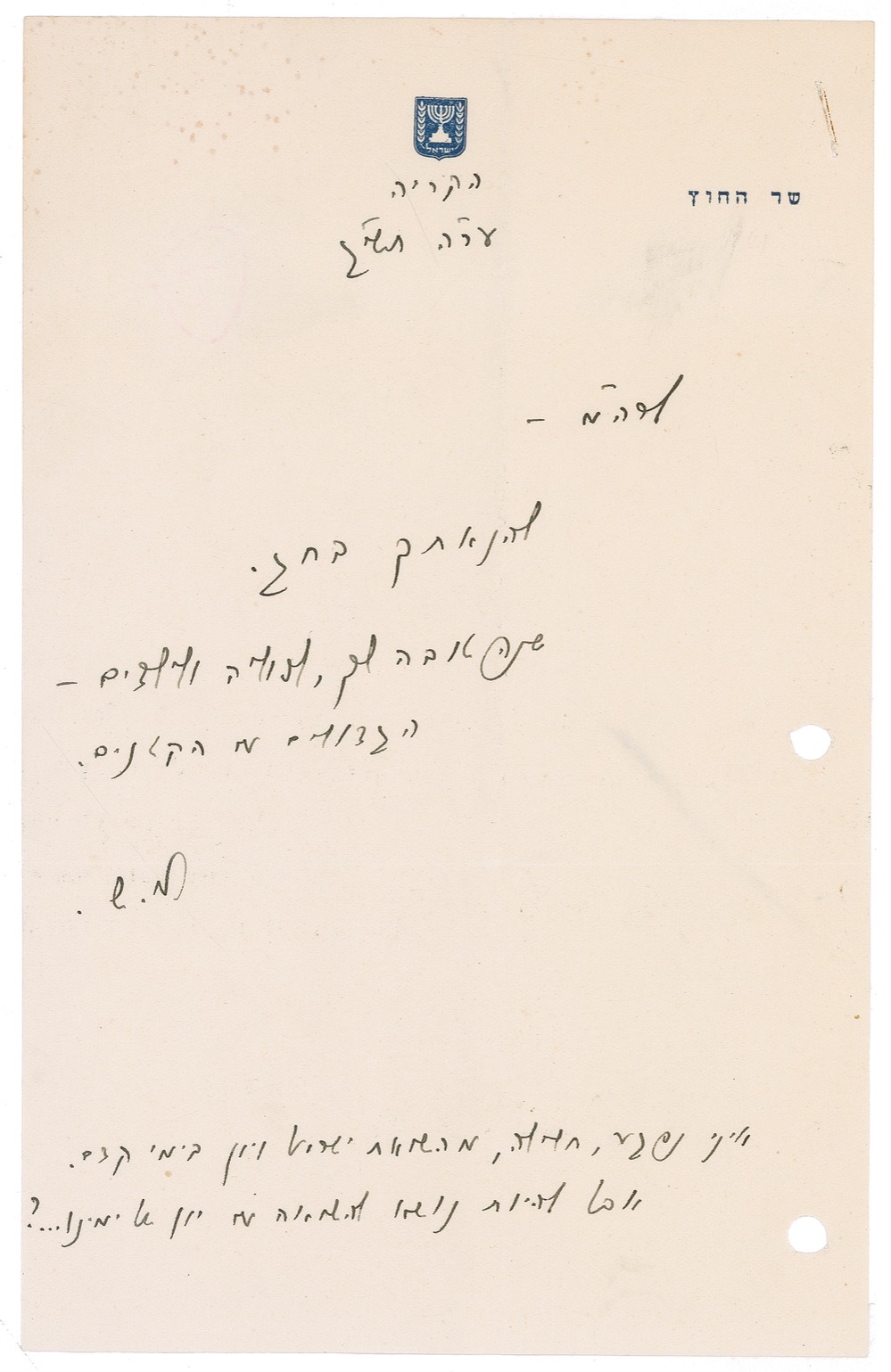 Second Prime Minister of Israel (1894–1965) who served from 1954–1955. ALS in Hebrew, signed “M. S.,” one page, 5.5 x 8.5, State of Israel letterhead, 1953. Short letter to the Prime Minister. In full: “Have pleasure during the holiday. Happy New Year to you, Paula, and your children—the big and the smalls.” Sharett also adds a brief postscript regarding a comparison between Israel and ancient and modern Greece. In fine condition, with intersecting mailing folds, paperclip impressions to top edge, and punch holes to right edge. RRAuction COA.
