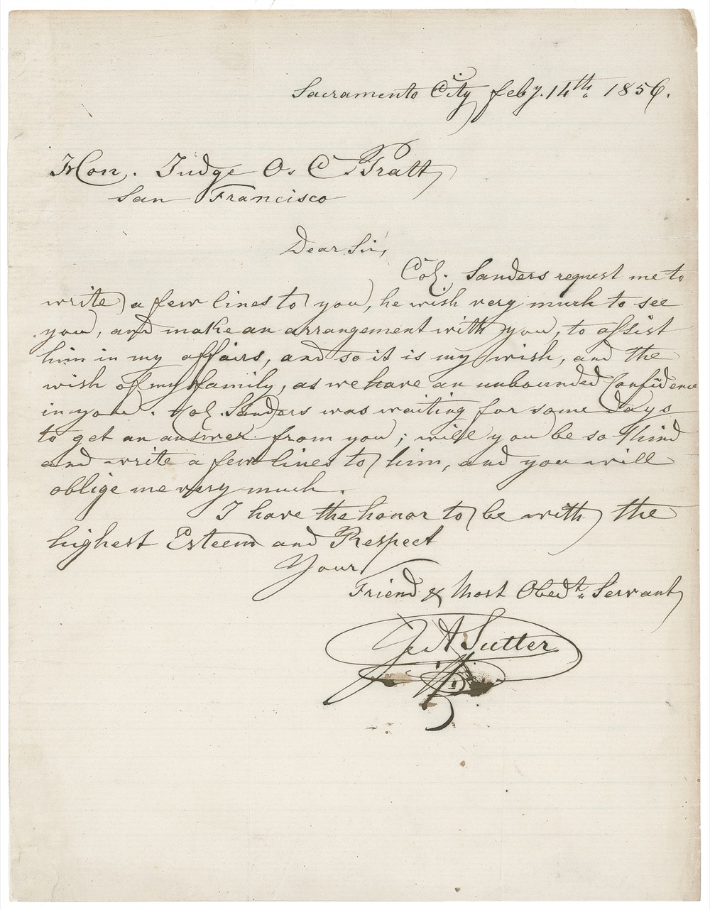 ALS signed “Jn. A. Sutter,” one page, lightly-lined, 8.25 x 10.5, February 14, 1856. Letter to Judge Orville C. Pratt. In full: “Col. Sanders request me to write a few lines to you, he wish very much to see you, and make an arrangement with you to assist him in my affairs, and so it is my wish, and the wish of my family, as we have an unbounded confidence in you. Col. Sanders was waiting for some days to get an answer from you; will you be so kind and write a few lines to him, and you will oblige me very much.” The letter has been cleanly and professionally backed, and shows some extra ink marks under signature, and light toning to edges, otherwise fine condition.
