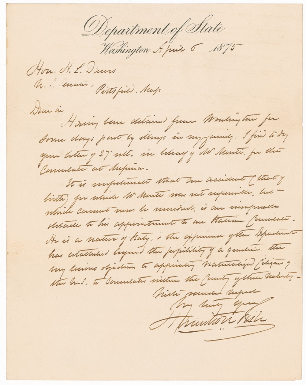 ALS, one page, 8 x 10, Department of State letterhead, April 6, 1875. Letter to a Massachusetts senator regarding a gentleman’s appointment to a consulate position. In part: “It is unfortunate that an accident (that of birth) for which Mr. Murti was not responsible but which cannot ever be remedied, is an improbable obstacle to his appointment to the Italian Consulate. He is a native of Italy & the experience of the Department has established beyond the possibility of a question the very serious objection to appointing naturalized citizens of the U. S. to consulates within the country of their nativity.” In fine condition, with some scattered light creasing and toning. RRAuction COA.