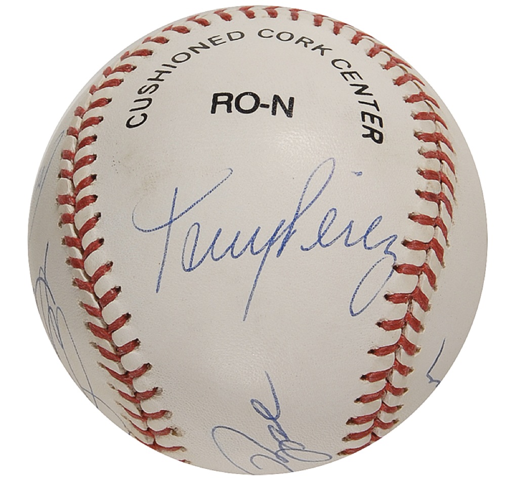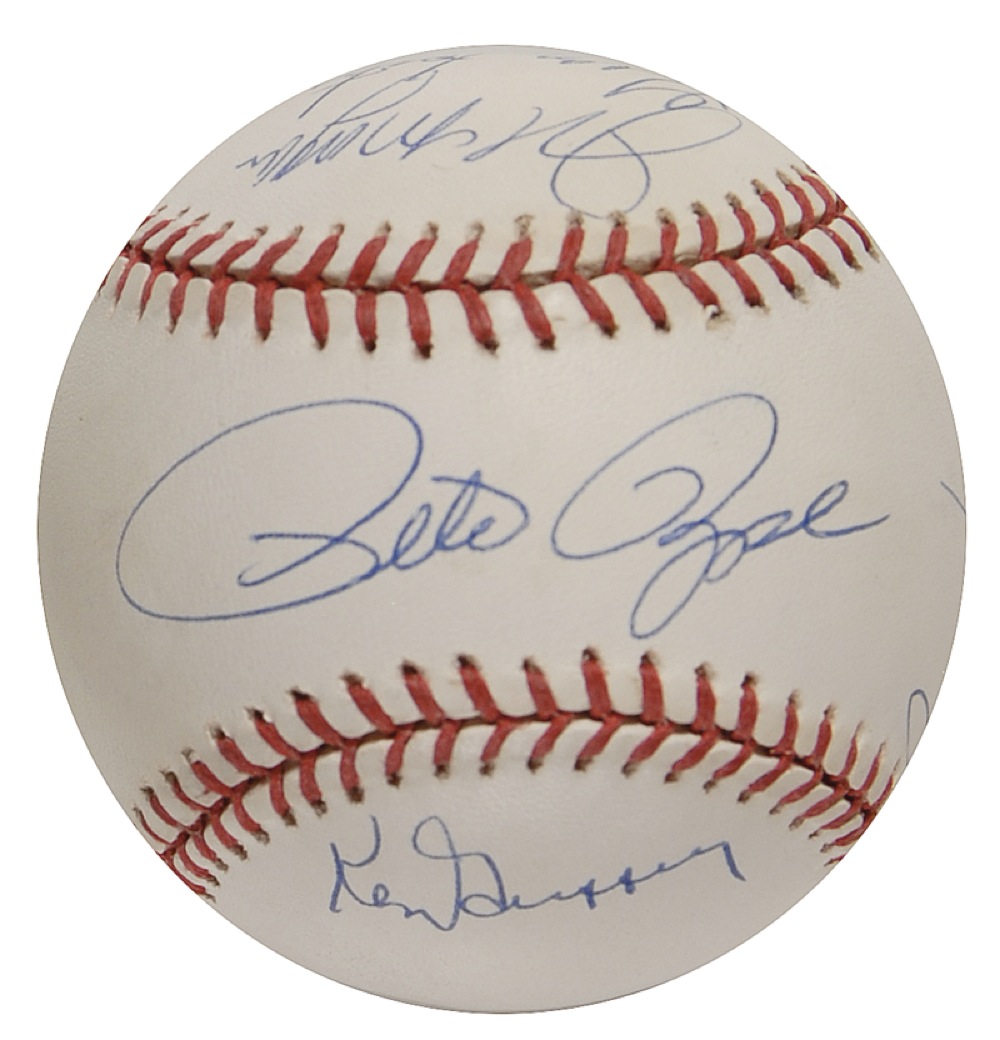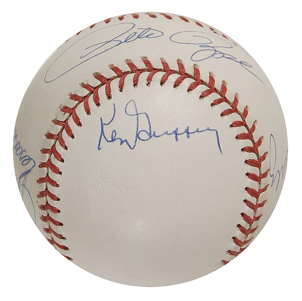 Official Rawlings National League baseball signed in blue ballpoint by all eight members of the starting line-up of the Big Red Machine: Pete Rose (ss), Ken Griffey, Joe Morgan, Tony Perez, George Foster, Johnny Bench, Cesar Geronimo, and Dave Concepcion. In fine condition, with a couple light spot spots of soiling. Pre-certified Steve Grad/PSA/DNA and RRAuction COA.