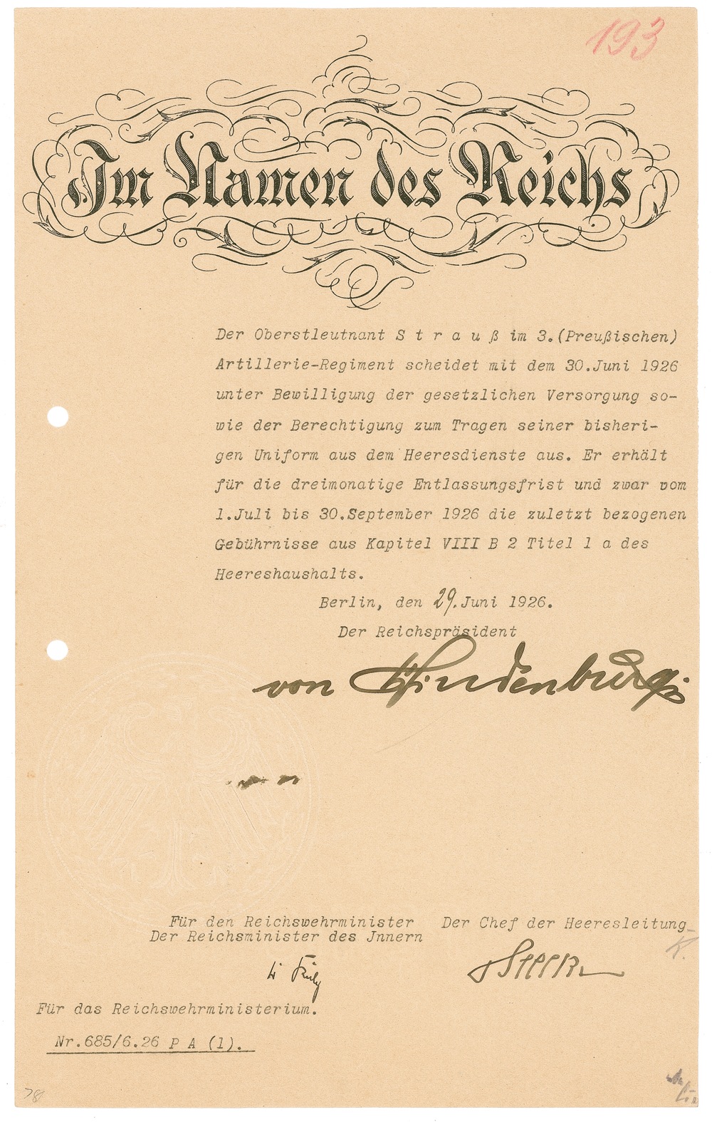 German World War I military hero (1847–1934) and president of Germany from 1925 to 1934. DS, in German, signed “von Hindenburg,” one page, 8 x 13, June 29, 1926. Official untranslated military document, boldly signed by von Hindenburg. Light uniform toning, two punch holes to left edge, and a couple small pencil notations, otherwise fine condition. Pre-certified PSA/DNA and RRAuction COA.
