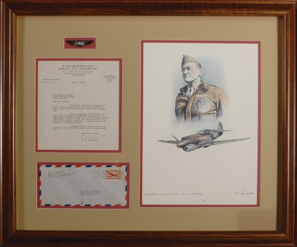 Air Force general (1893–1958) who commanded the famous Flying Tigers during World War II. TLS signed “C. L. Chennault,” one page, 7.75 x 8.5, CNRRA Air Transport letterhead, May 14, 1947. Letter concerning the negative prospects of an American joining the Chinese Air Force. In part, “To my knowledge, the Chinese Air Force has no opening for American pilots, and the only likely prospect would be in the transport field. Therefore, I regret to say that because you do not have any transport experience, I cannot suggest any opening at the present time.” Double matted and framed with the original mailing envelope, a hand-colored artist’s proof print of Chennault, and a pair of Chinese Air Force wings, to an overall size of 29 x 24. In fine condition, with mailing fold through tops of a few letters of signature, and a vertical crease to left edge. Oversized. Pre-certified PSA/DNA and RRAuction COA.