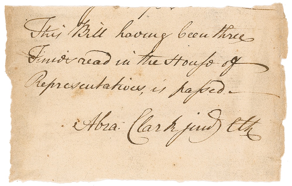 Signer of the Declaration of Independence from New Jersey (1726–1794). Self-contained partial ADS, signed “Abra. Clark jun th,” one page, 40.25 x 2.75, no date. Document reads: “This Bill having been three times read in the House of Representatives is passed.” In fine condition, with rough vertical edges, and some scattered light soiling and toning. In his 1995 reference History Comes to Life, Kenneth Rendell places Clark’s autograph material into the “rare” category among the Signers. Pre-certified John Reznikoff/PSA/DNA and RRAuction COA.